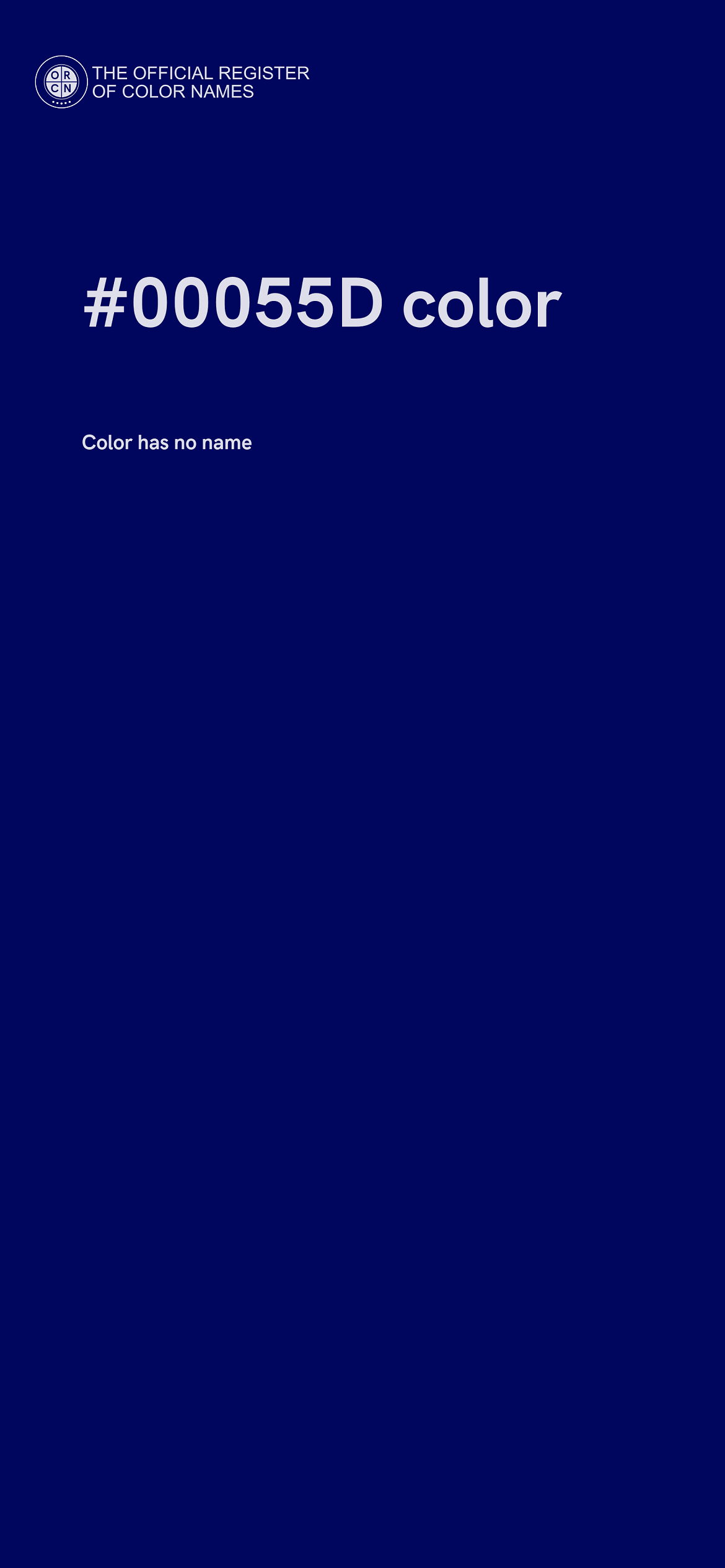 The digital color HEX #00055D belongs to the Blue Color Family featuring Full Saturation (Saturation Family) and Dark (Brightness Family).