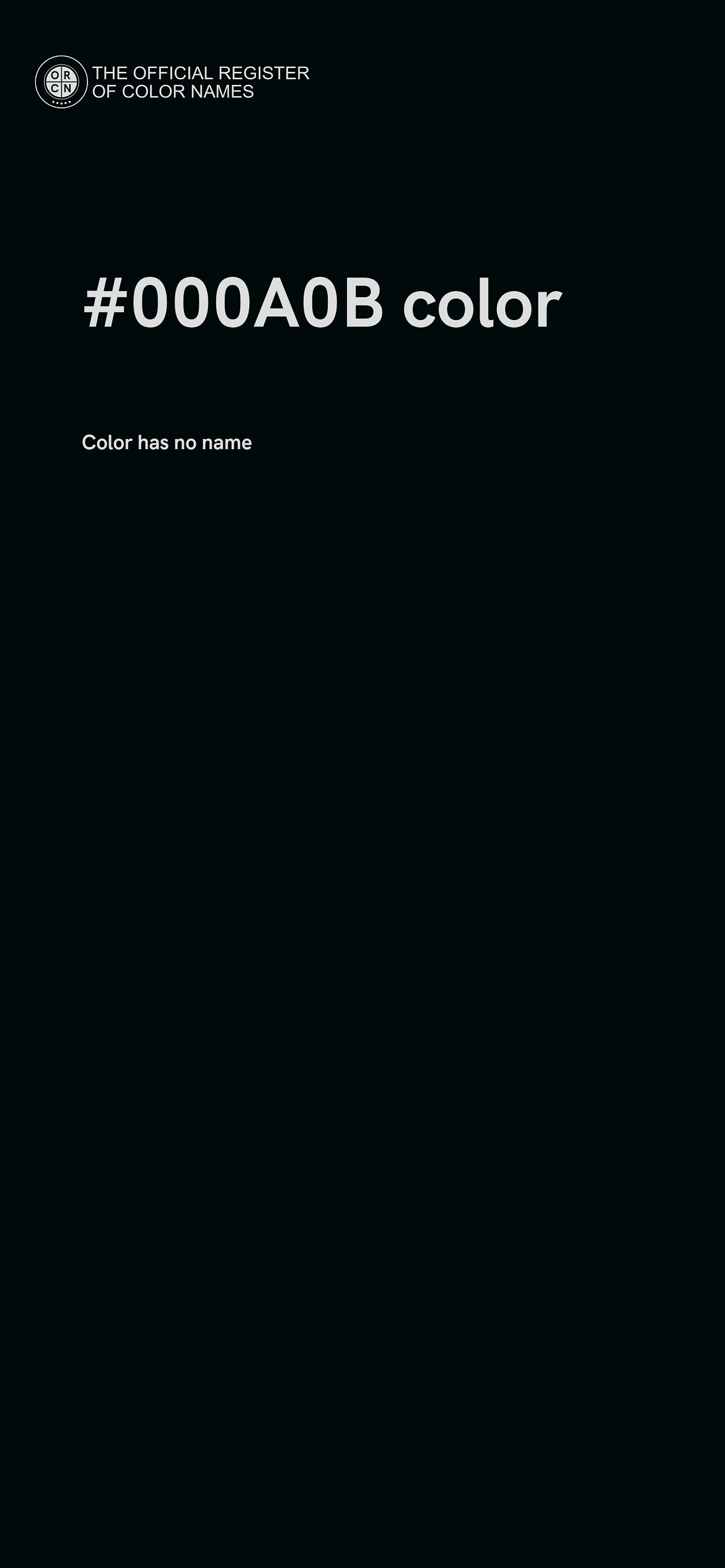 The digital color HEX #000A0B belongs to the Cyan Color Family featuring Full Saturation (Saturation Family) and Very Dark (Brightness Family).
