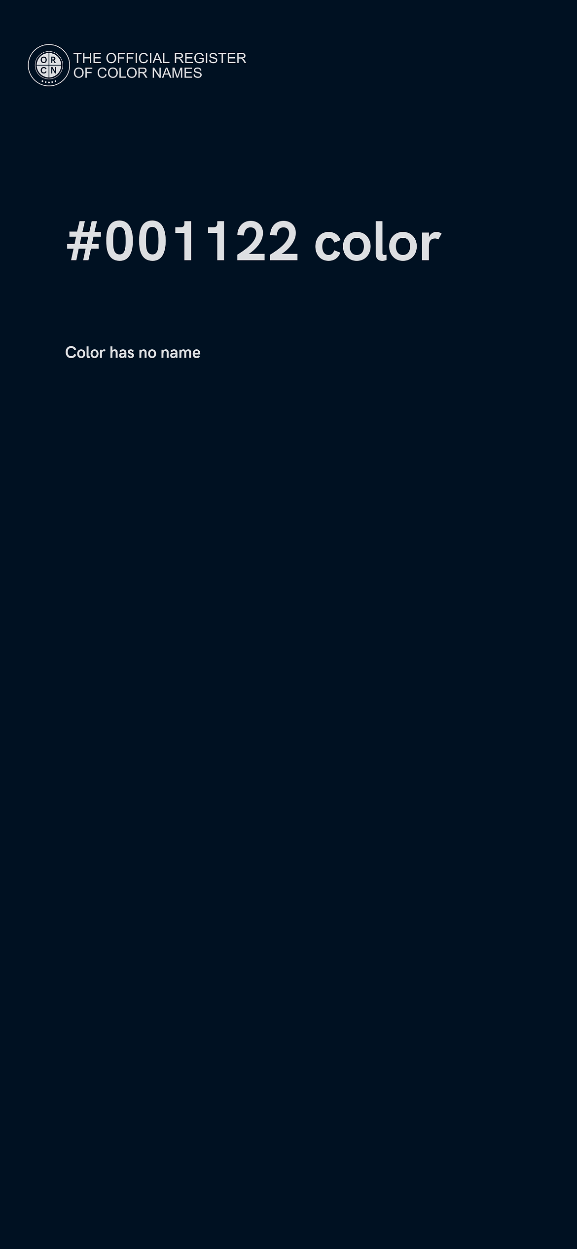 For printing in non digital world, #001122 is represented in CMYK as 13 Cyan, 7 Magenta, 0 Yellow, and 87 Black (Key) (C:13 M:7 Y:0 K:87).