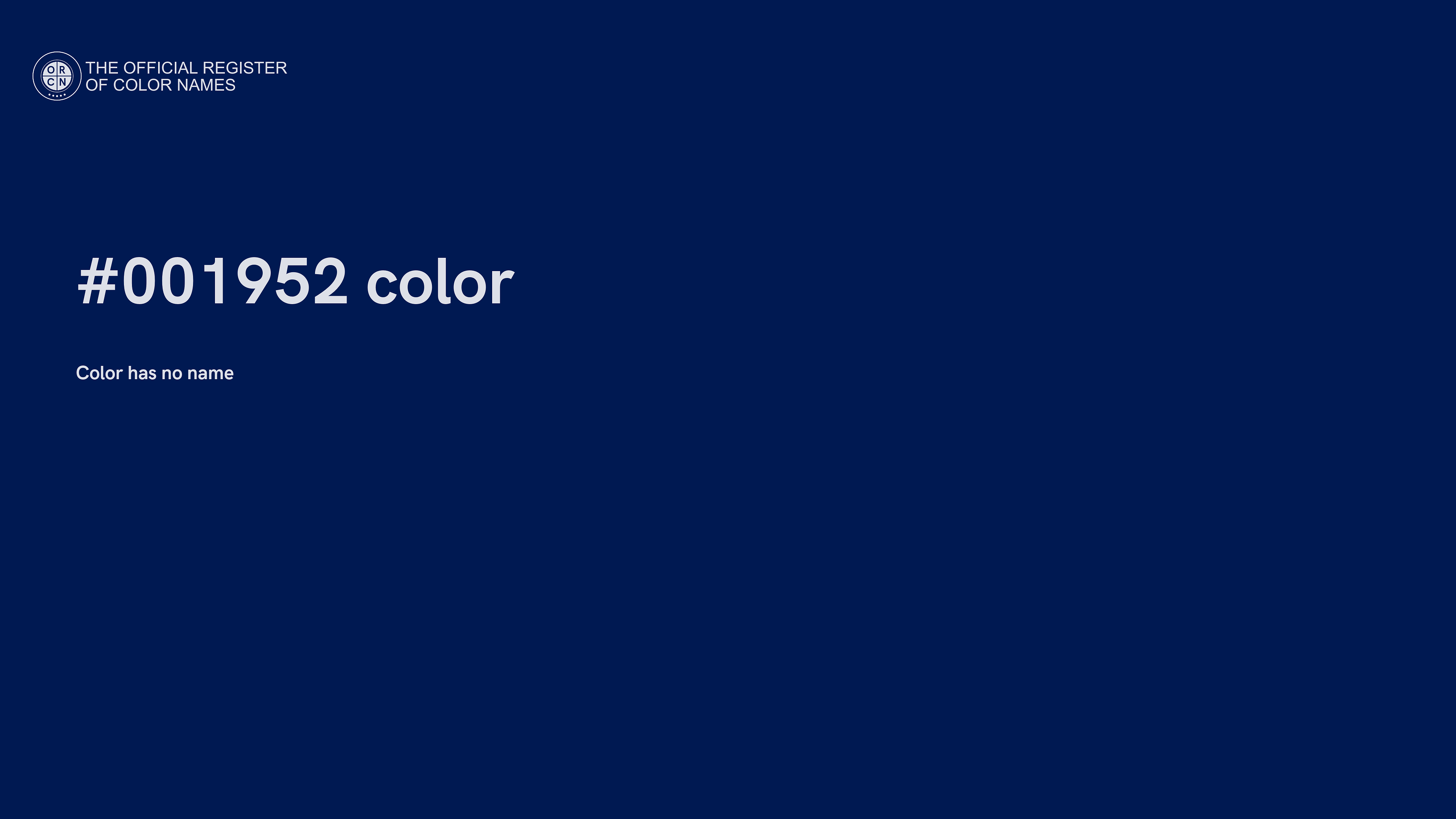 The digital color HEX #001952 belongs to the Azure Color Family featuring Full Saturation (Saturation Family) and Dark (Brightness Family).