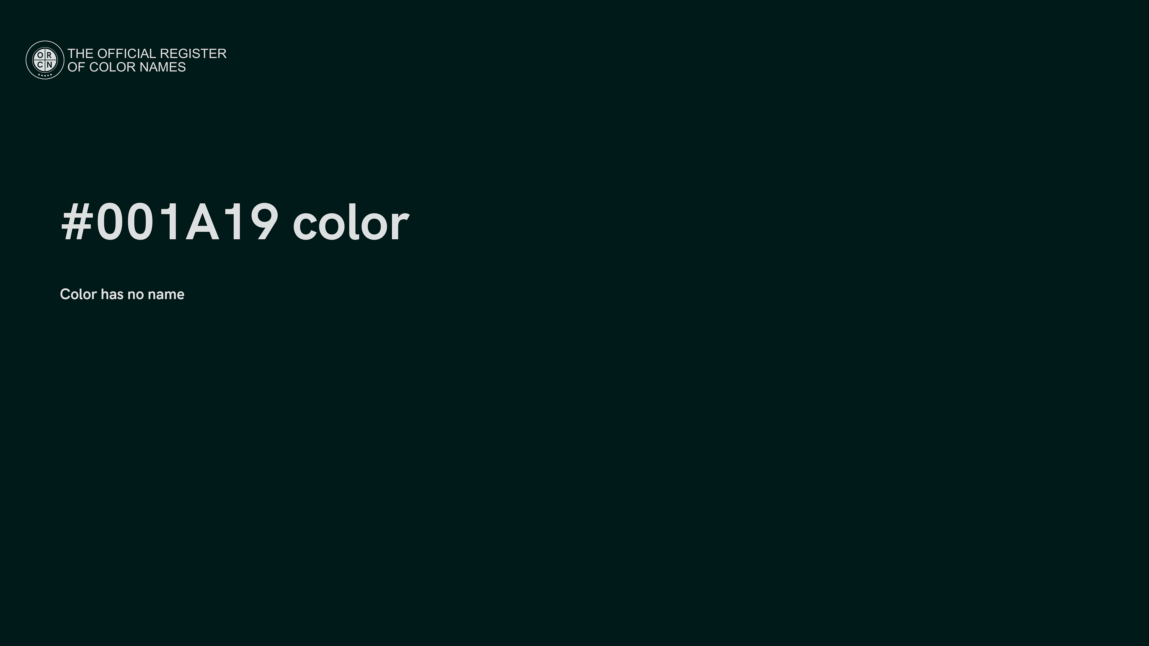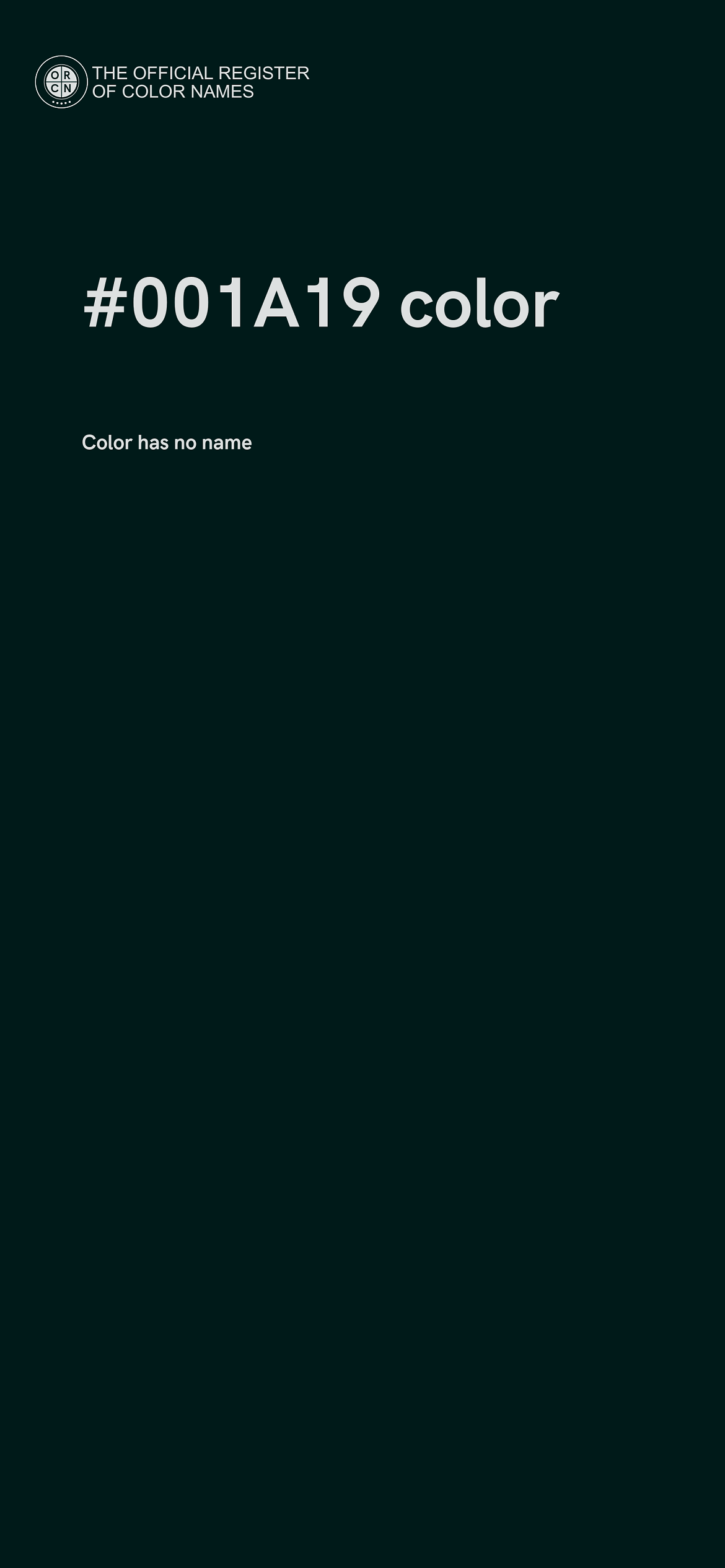 The digital color HEX #001A19 belongs to the Cyan Color Family featuring Full Saturation (Saturation Family) and Very Dark (Brightness Family).