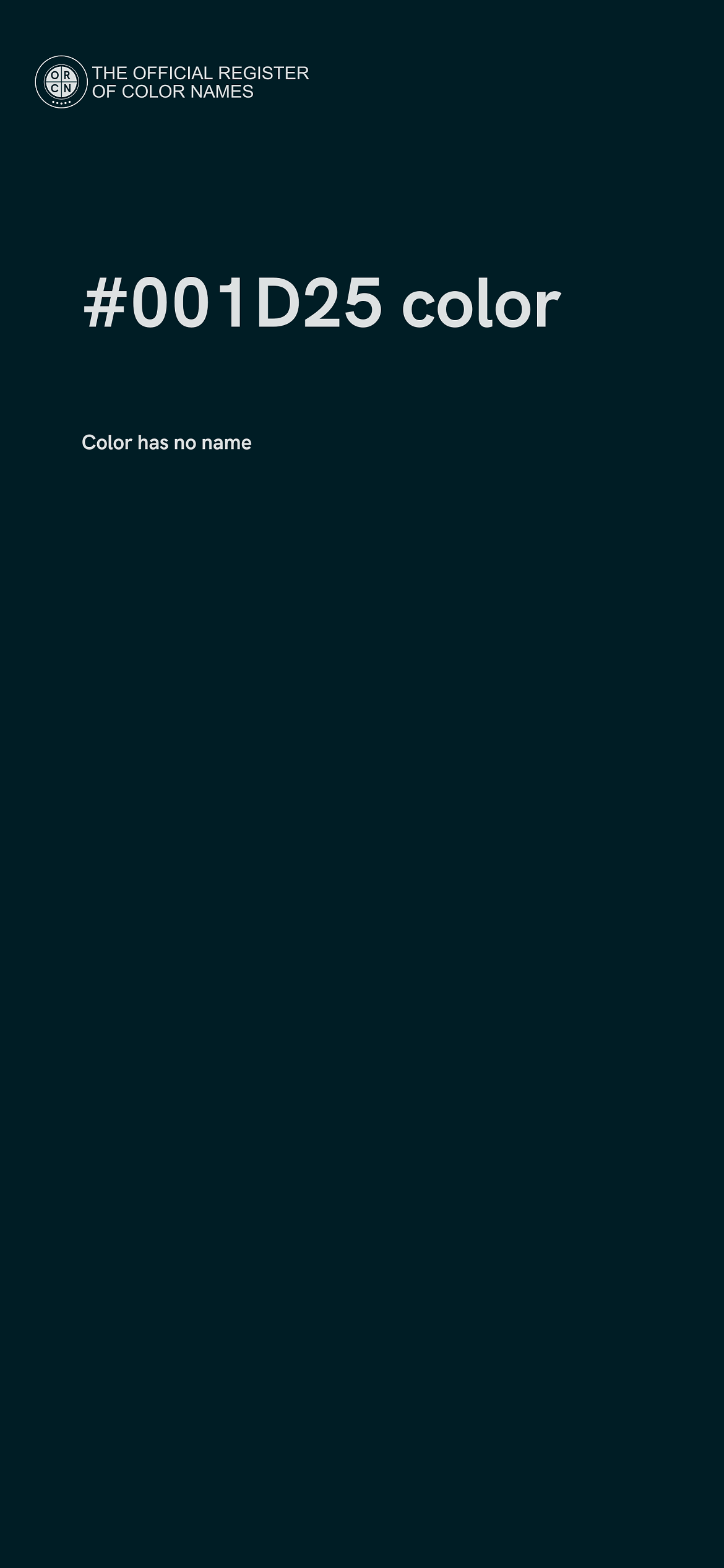 The digital color HEX #001D25 belongs to the Cyan Color Family featuring Full Saturation (Saturation Family) and Very Dark (Brightness Family).