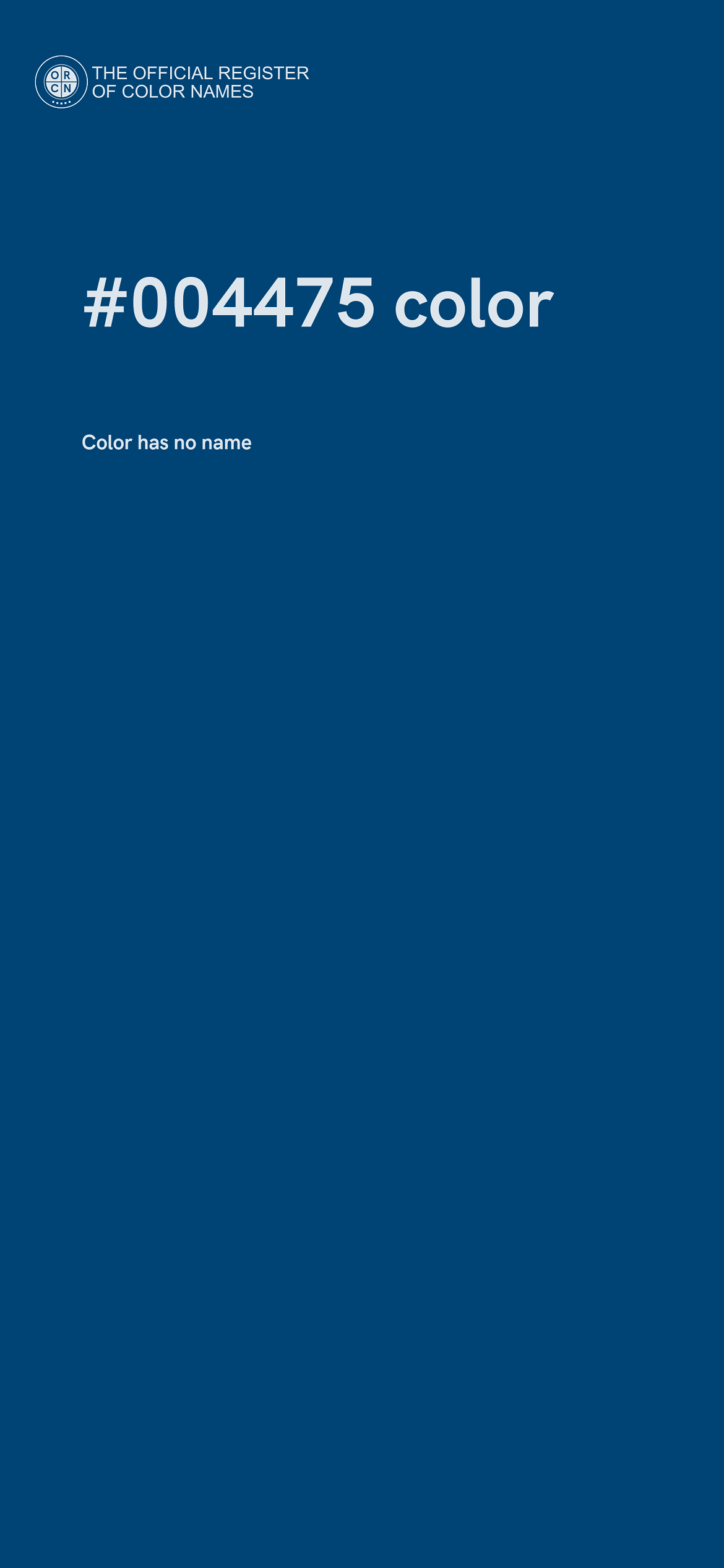 For printing in non digital world, #004475 is represented in CMYK as 46 Cyan, 19 Magenta, 0 Yellow, and 54 Black (Key) (C:46 M:19 Y:0 K:54).