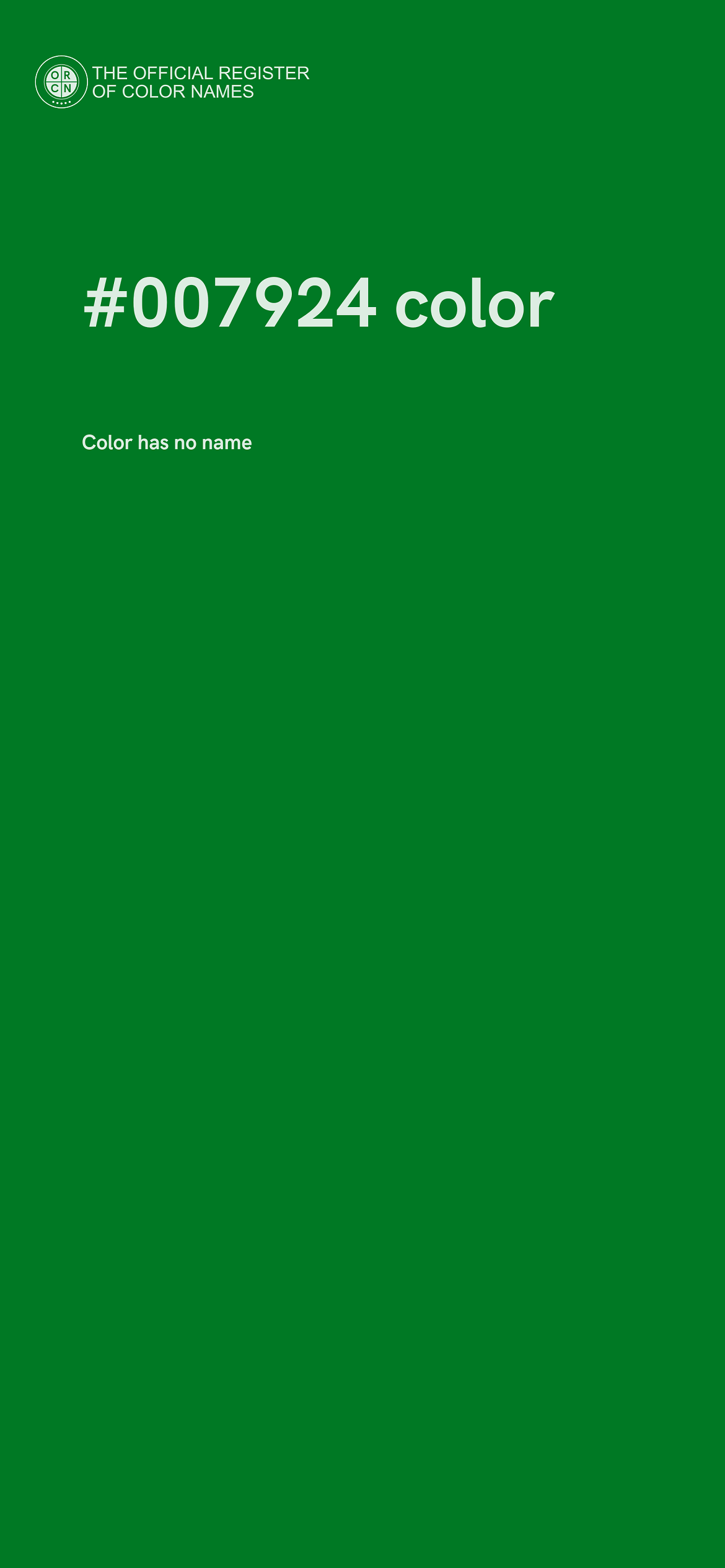 The digital color HEX #007924 belongs to the Spring Green Color Family featuring Full Saturation (Saturation Family) and Dark (Brightness Family).