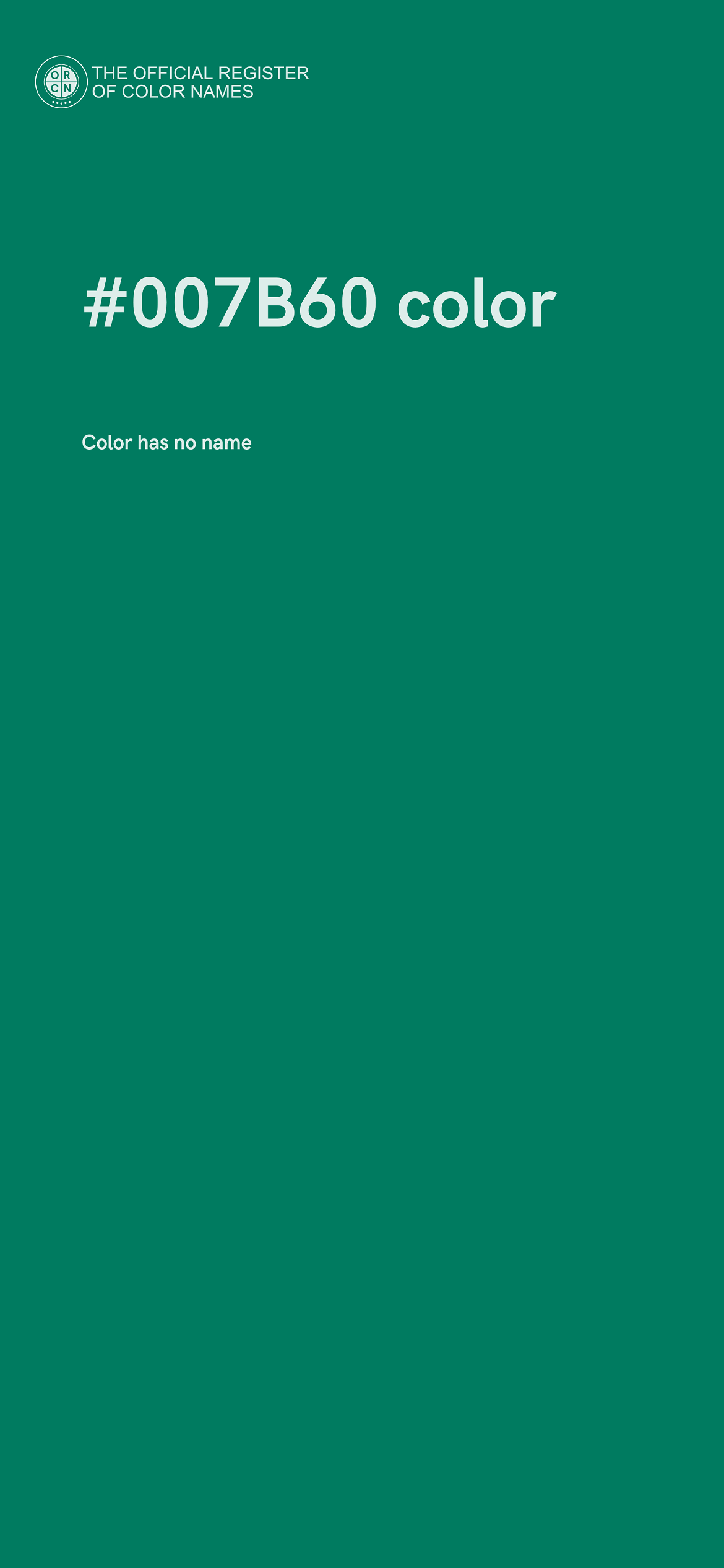 The digital color HEX #007B60 belongs to the Cyan Color Family featuring Full Saturation (Saturation Family) and Dark (Brightness Family).