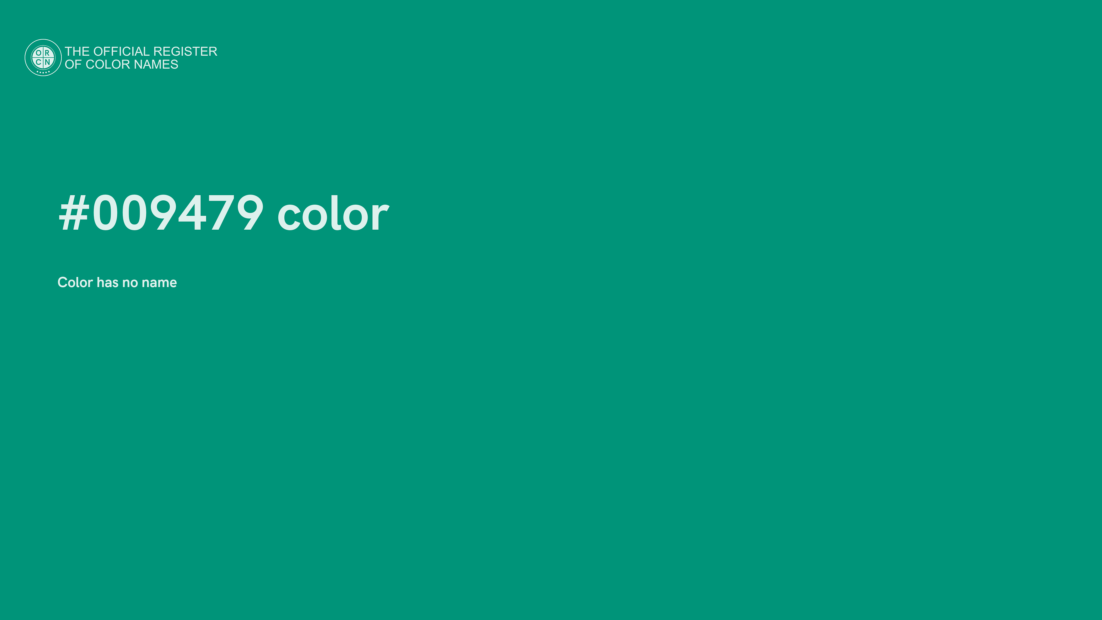 The digital color HEX #009479 belongs to the Cyan Color Family featuring Full Saturation (Saturation Family) and Neutral (Brightness Family).