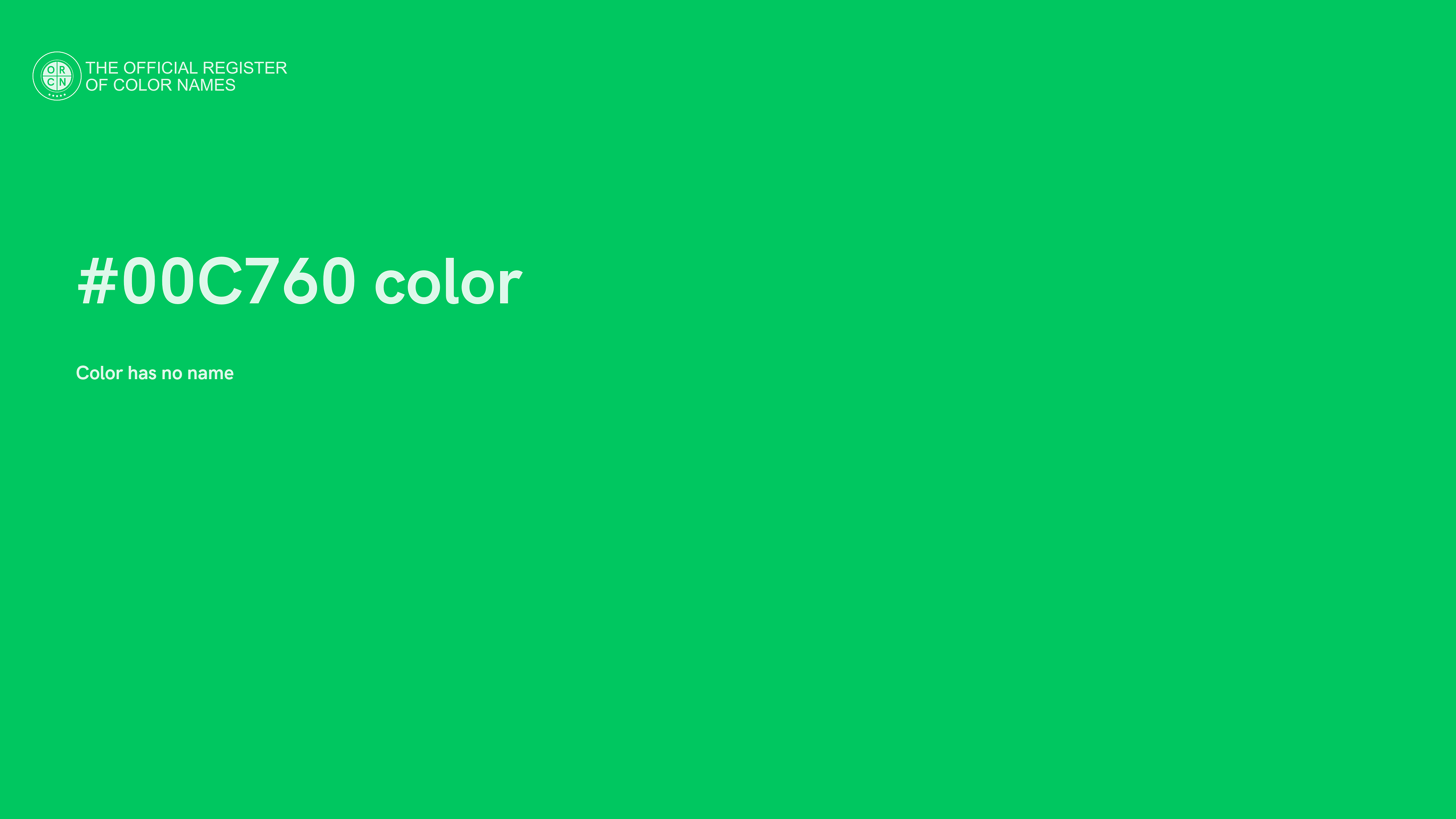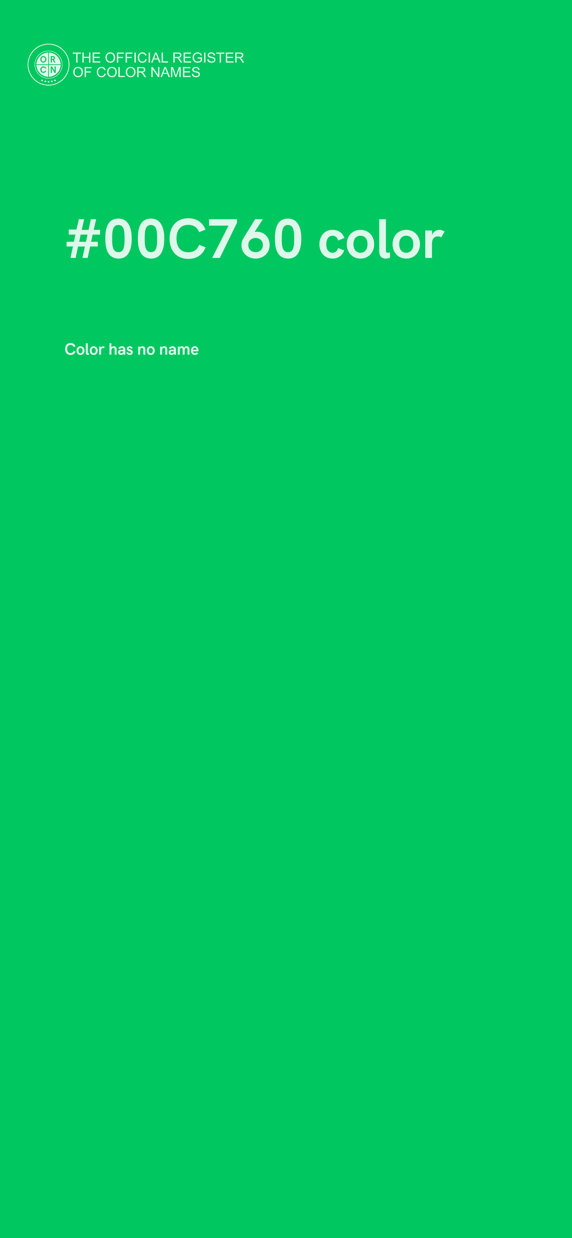 The digital color HEX #00C760 belongs to the Spring Green Color Family featuring Full Saturation (Saturation Family) and Neutral (Brightness Family).