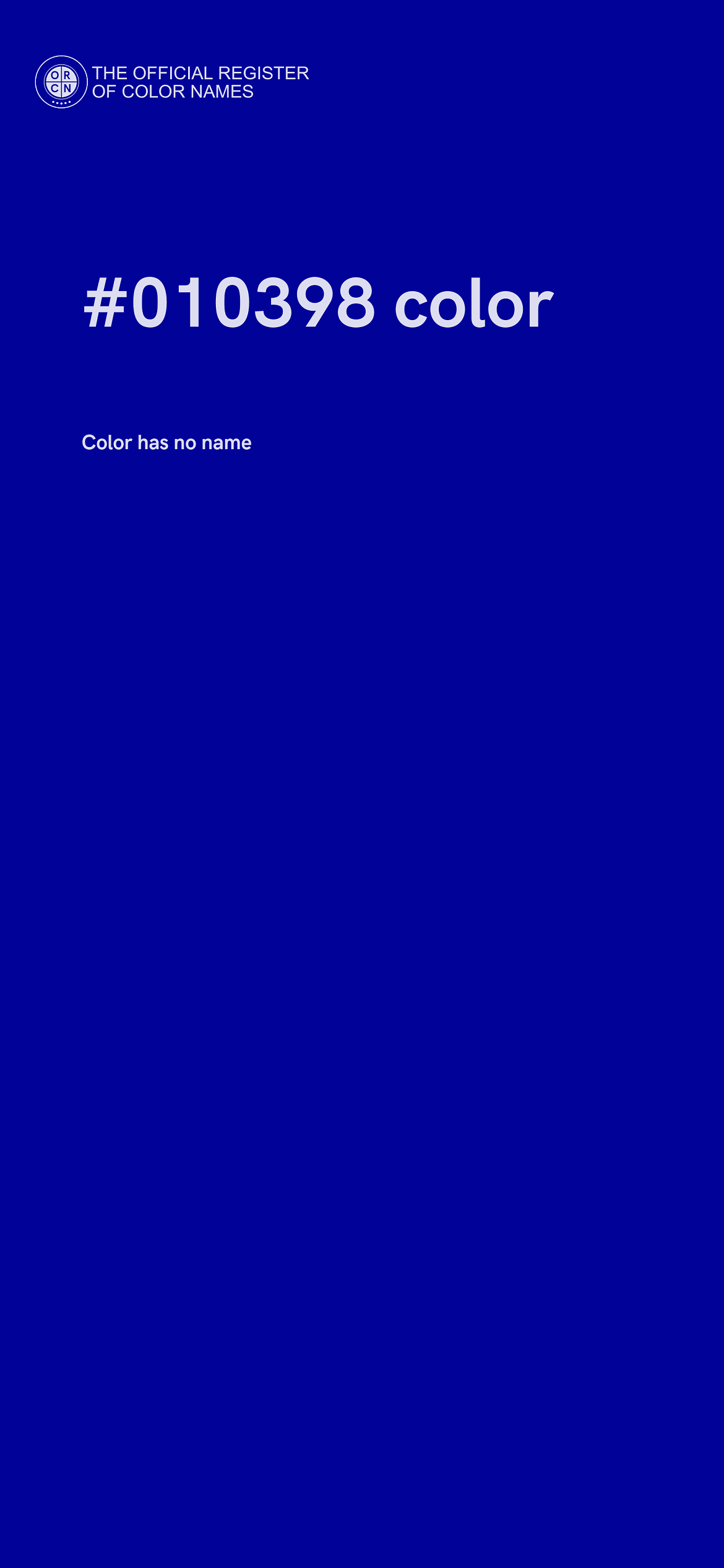 The digital color HEX #010398 belongs to the Blue Color Family featuring Full Saturation (Saturation Family) and Neutral (Brightness Family).