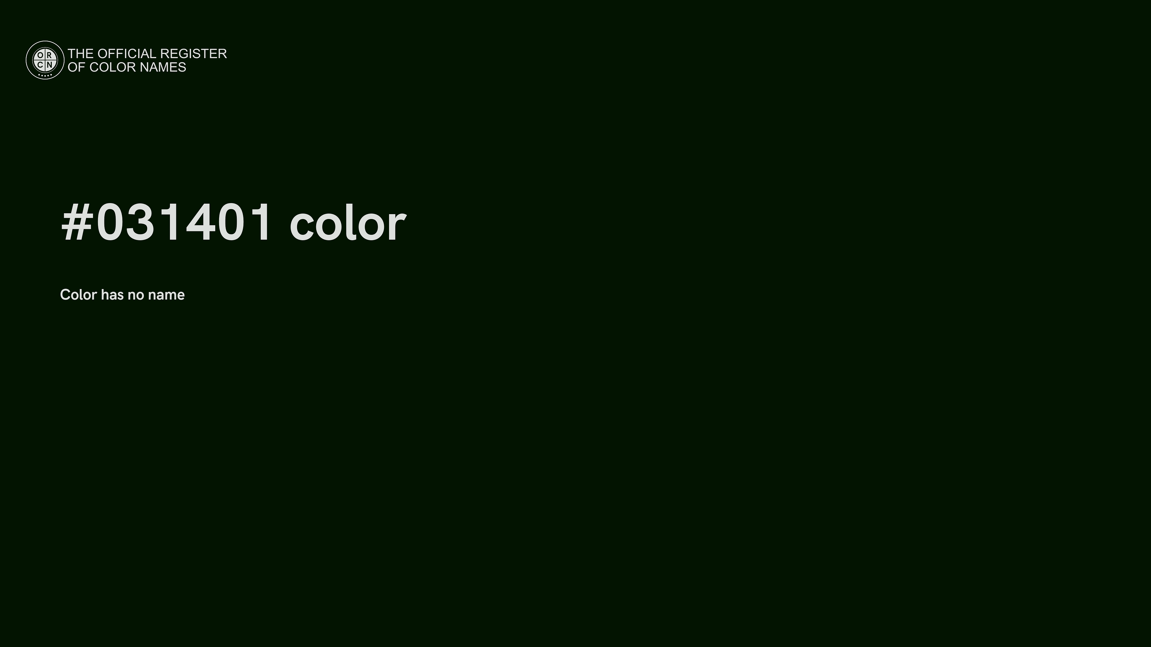 The digital color HEX #031401 belongs to the Green Color Family featuring Full Saturation (Saturation Family) and Very Dark (Brightness Family).