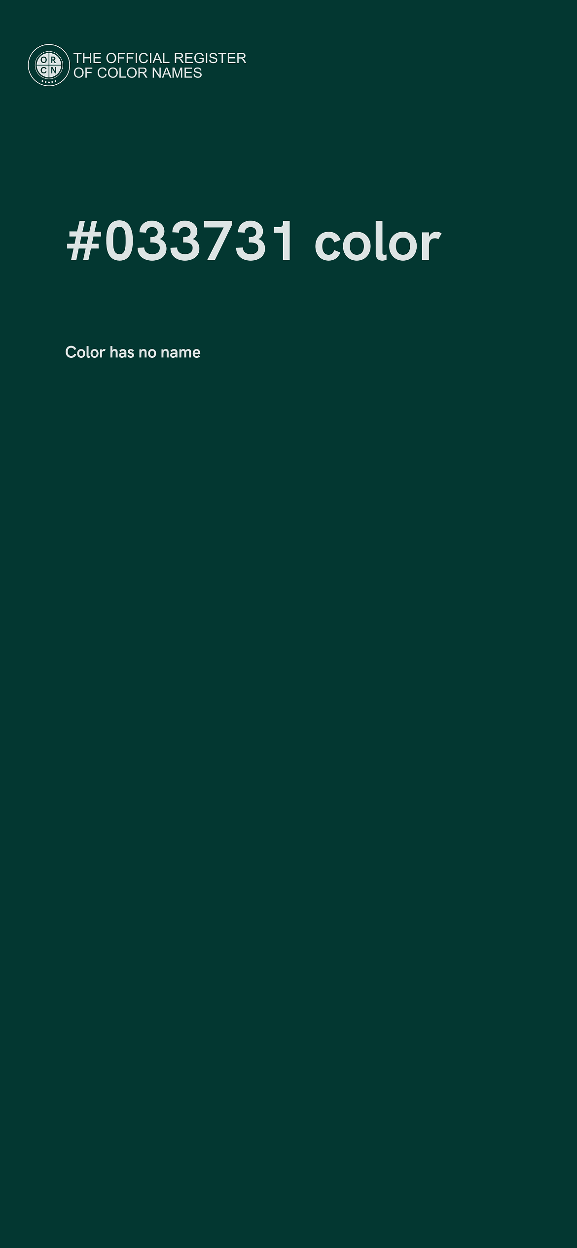 The digital color HEX #033731 belongs to the Cyan Color Family featuring Full Saturation (Saturation Family) and Dark (Brightness Family).