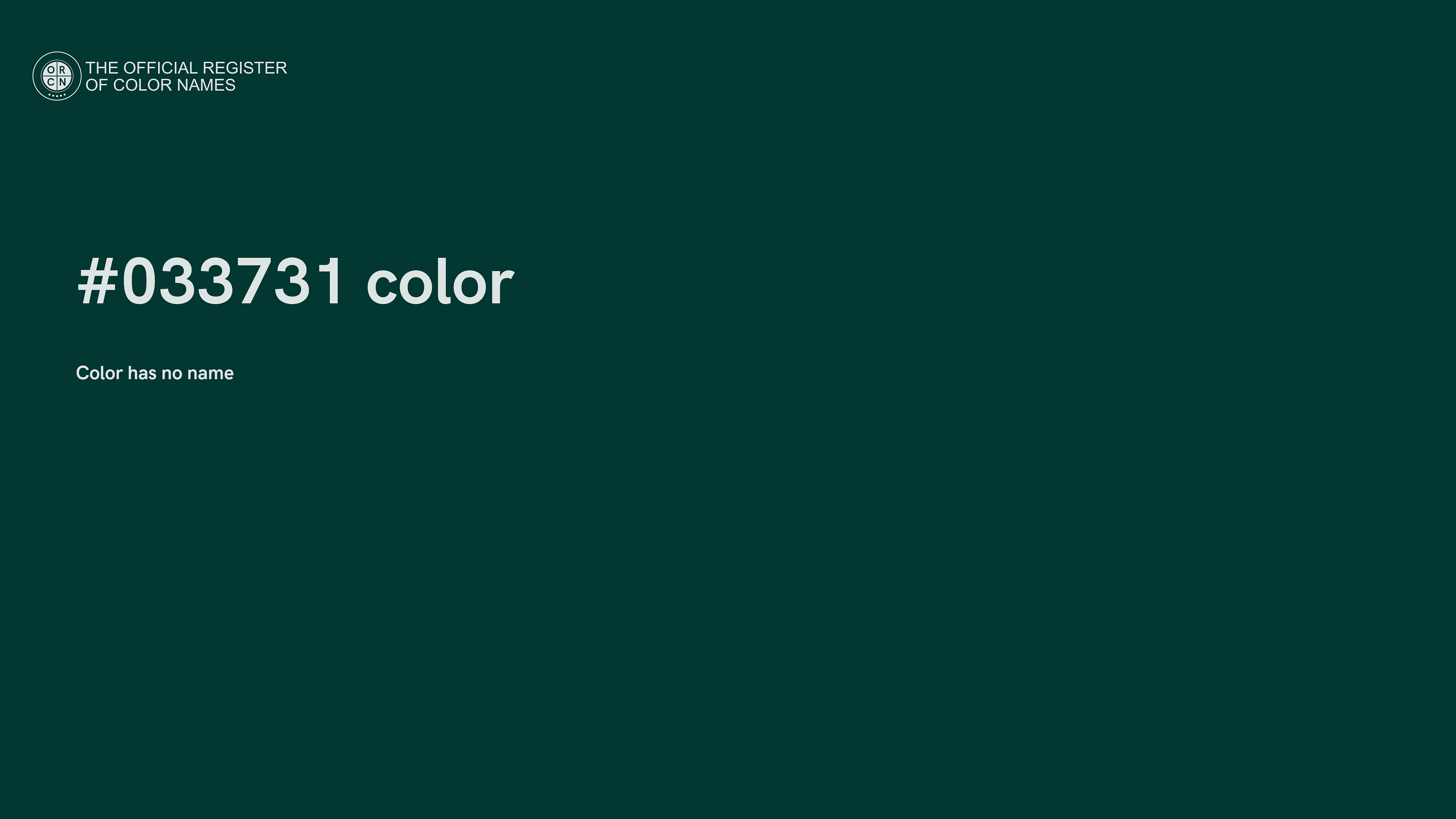 HEX code #033731 represent the color in hexadecimal format by combining three values – the amounts of Red, Green and Blue (RGB). Its RGB composition is 3, 55, 49 ( rgb(3, 55, 49) ), which breaks down into 1.2% of Red, 21.6% Green and 19.2% Blue.