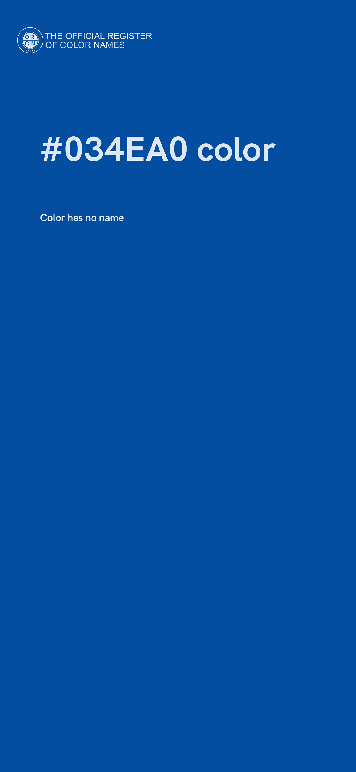 The digital color HEX #034EA0 belongs to the Azure Color Family featuring Full Saturation (Saturation Family) and Neutral (Brightness Family).