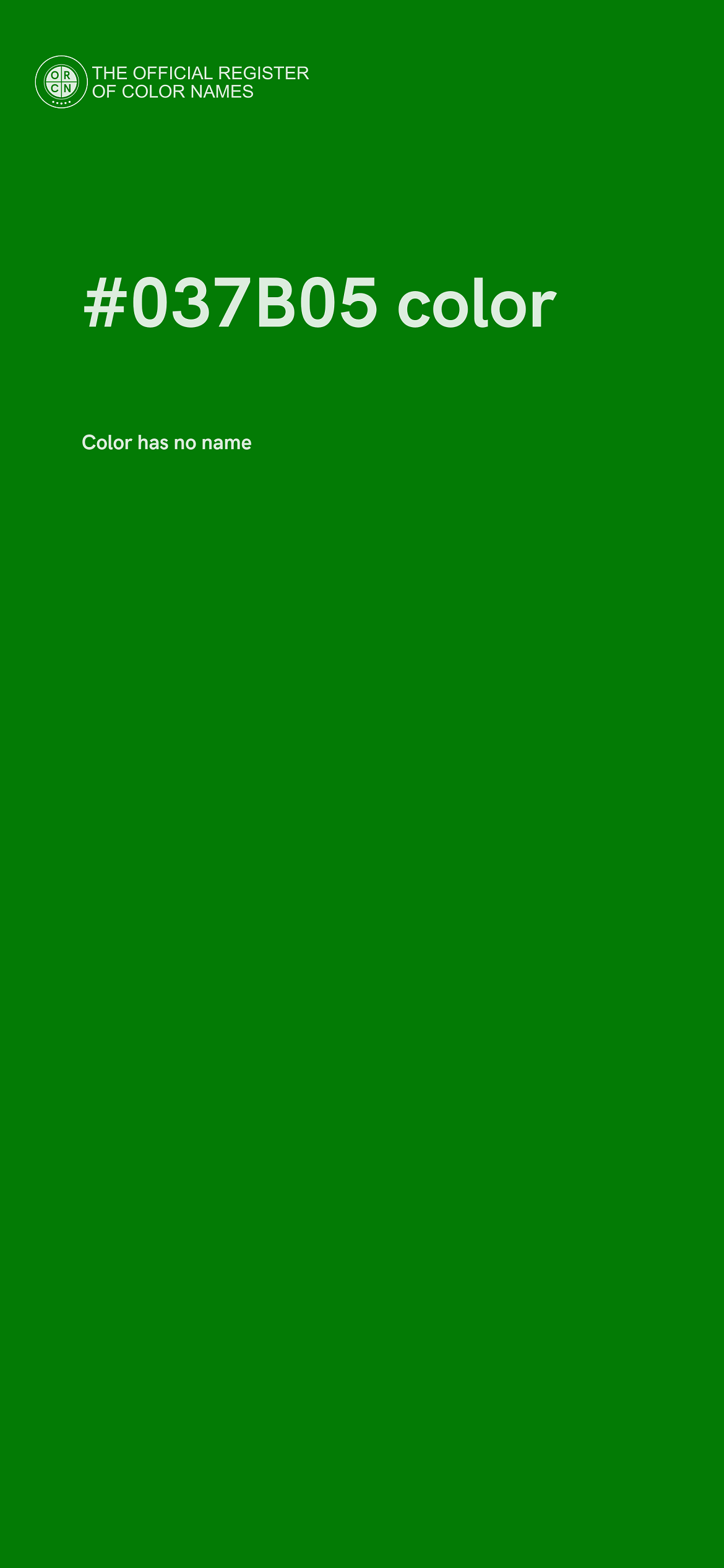 The digital color HEX #037B05 belongs to the Green Color Family featuring Full Saturation (Saturation Family) and Neutral (Brightness Family).