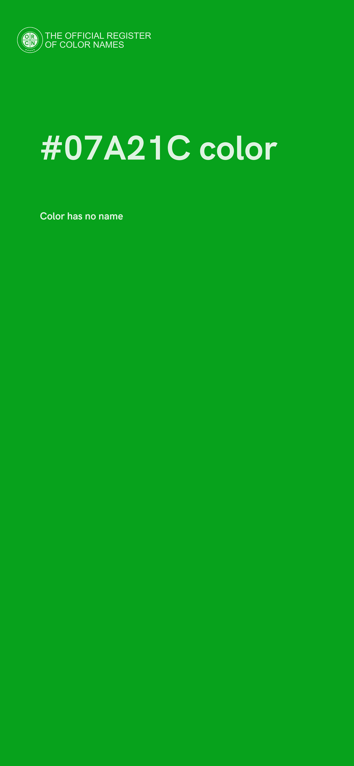 The digital color HEX #07A21C belongs to the Green Color Family featuring Full Saturation (Saturation Family) and Neutral (Brightness Family).