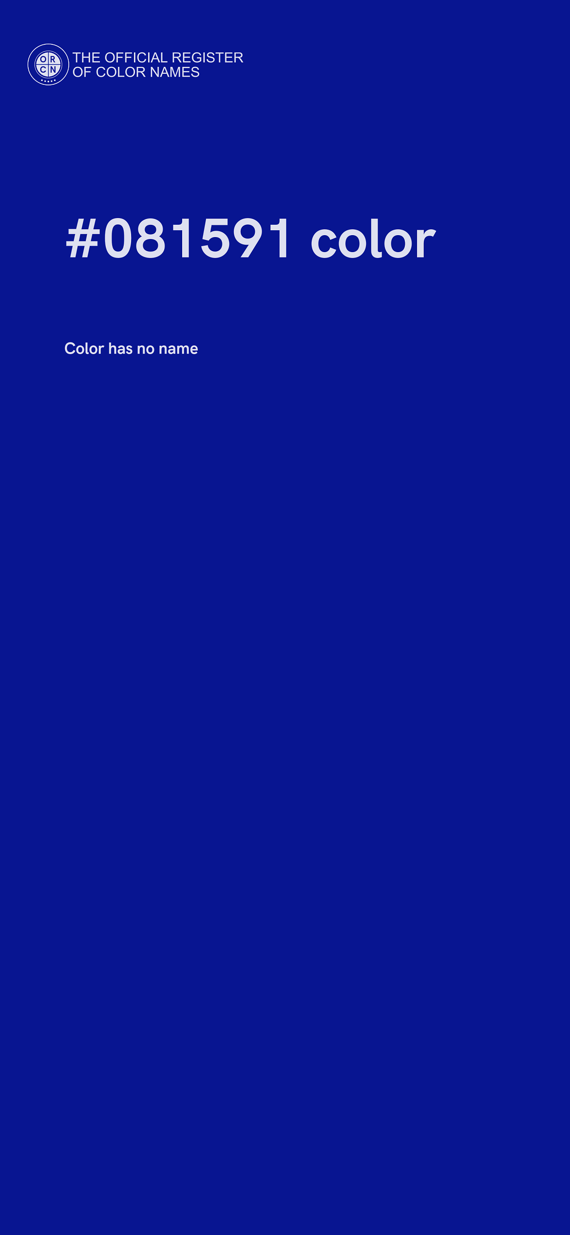 The digital color HEX #081591 belongs to the Blue Color Family featuring Full Saturation (Saturation Family) and Neutral (Brightness Family).