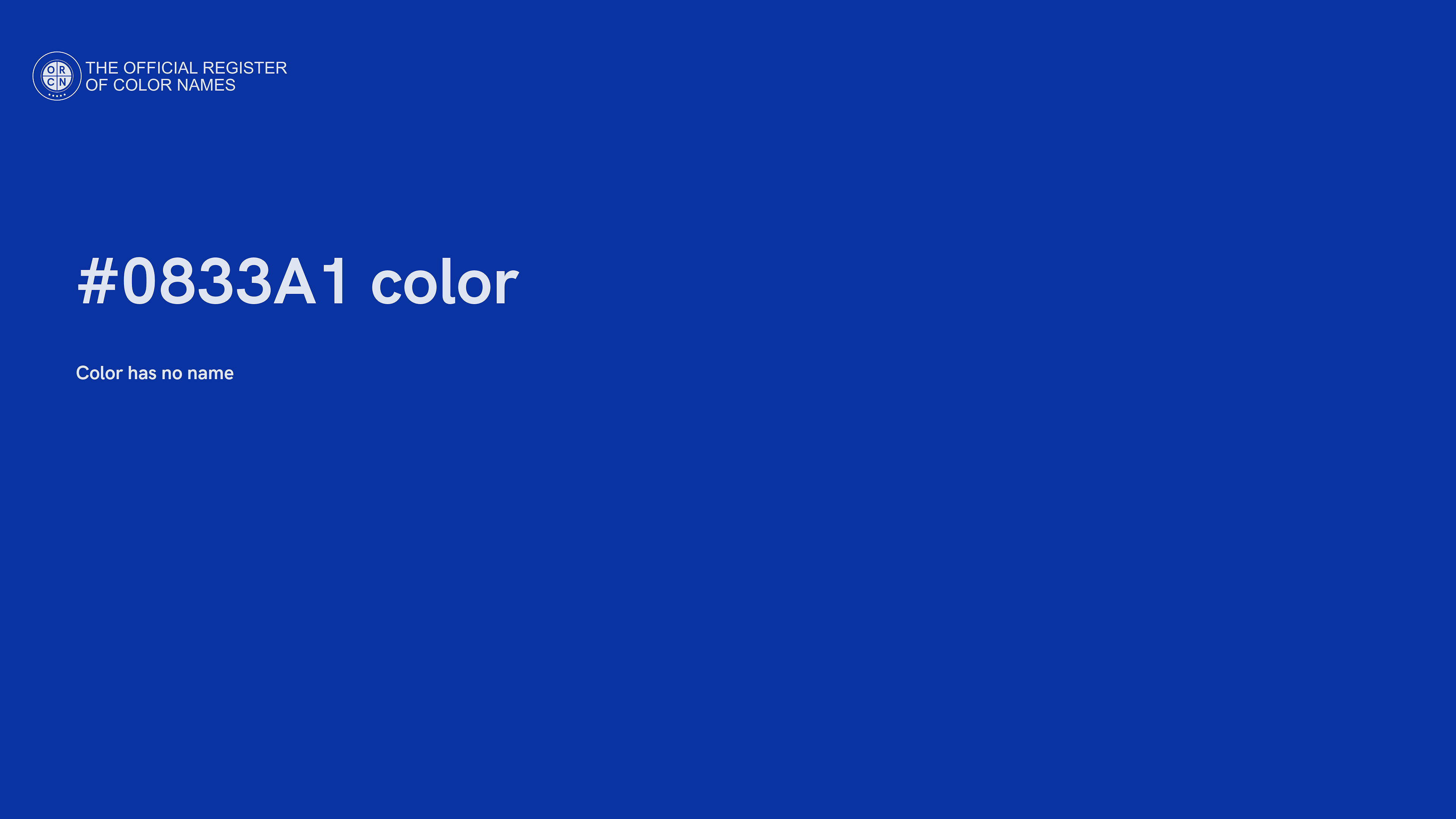The digital color HEX #0833A1 belongs to the Azure Color Family featuring Full Saturation (Saturation Family) and Neutral (Brightness Family).
