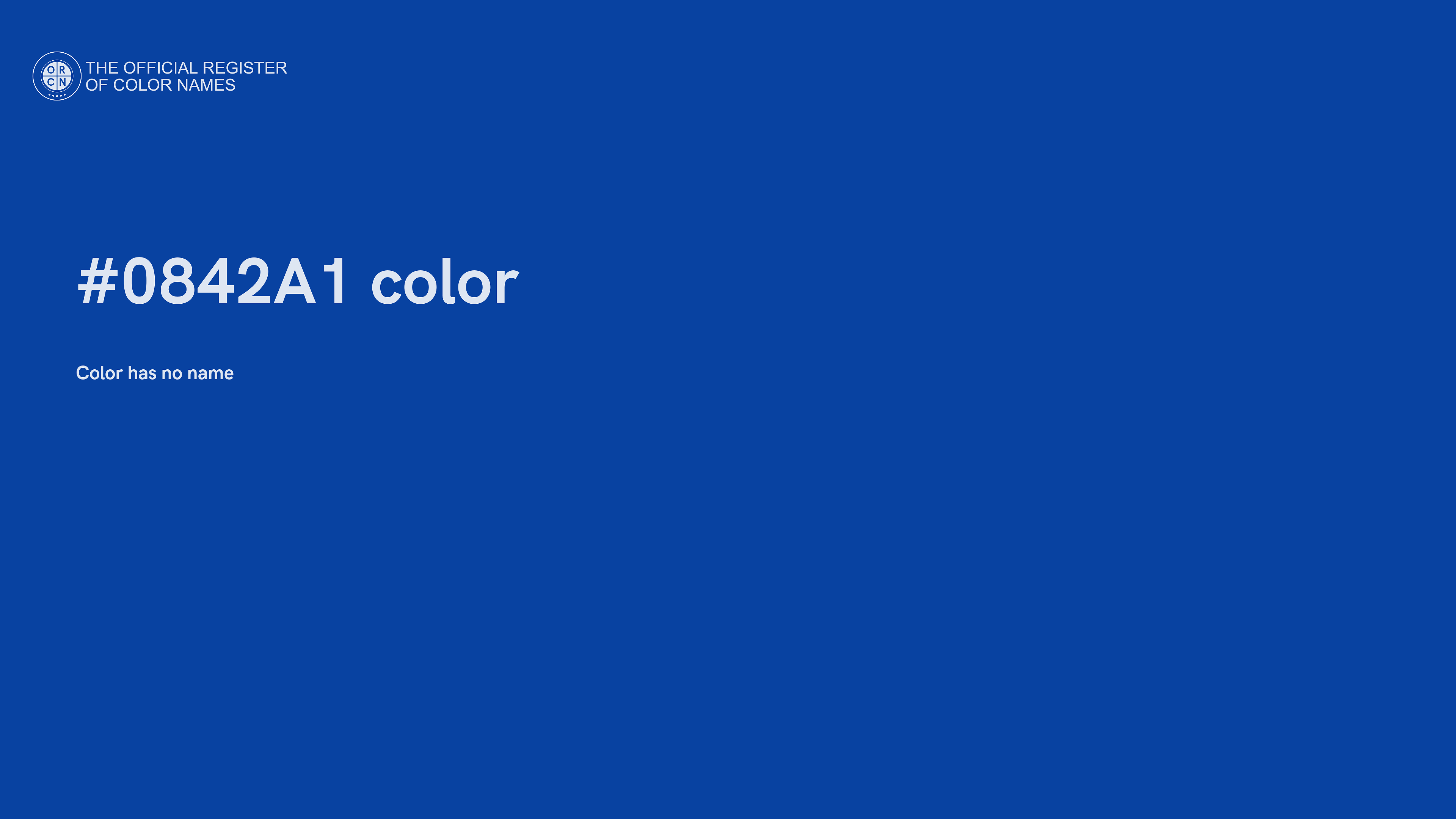 The digital color HEX #0842A1 belongs to the Azure Color Family featuring Full Saturation (Saturation Family) and Neutral (Brightness Family).