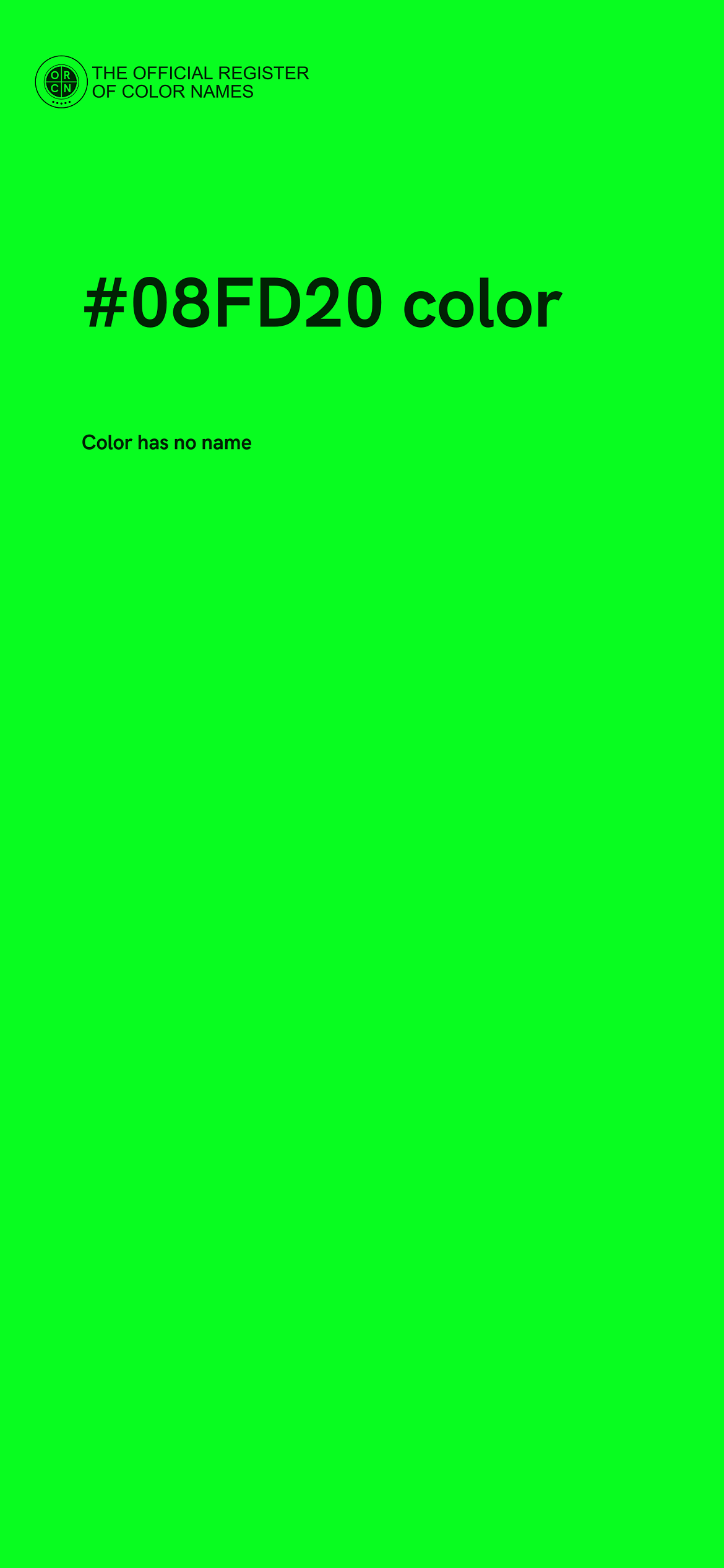 The digital color HEX #08FD20 belongs to the Green Color Family featuring Full Saturation (Saturation Family) and Light (Brightness Family).