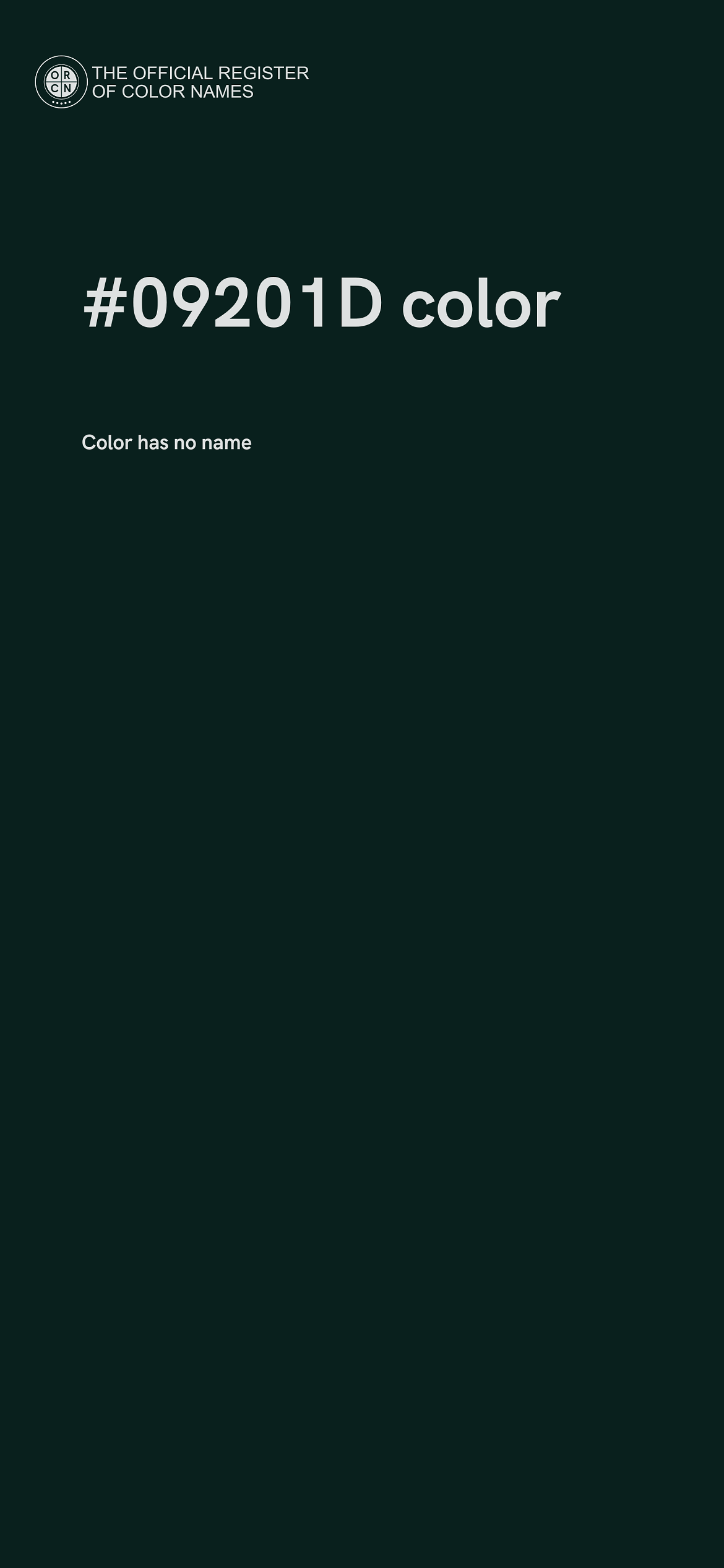 The digital color HEX #09201D belongs to the Cyan Color Family featuring Moderate Saturation (Saturation Family) and Very Dark (Brightness Family).