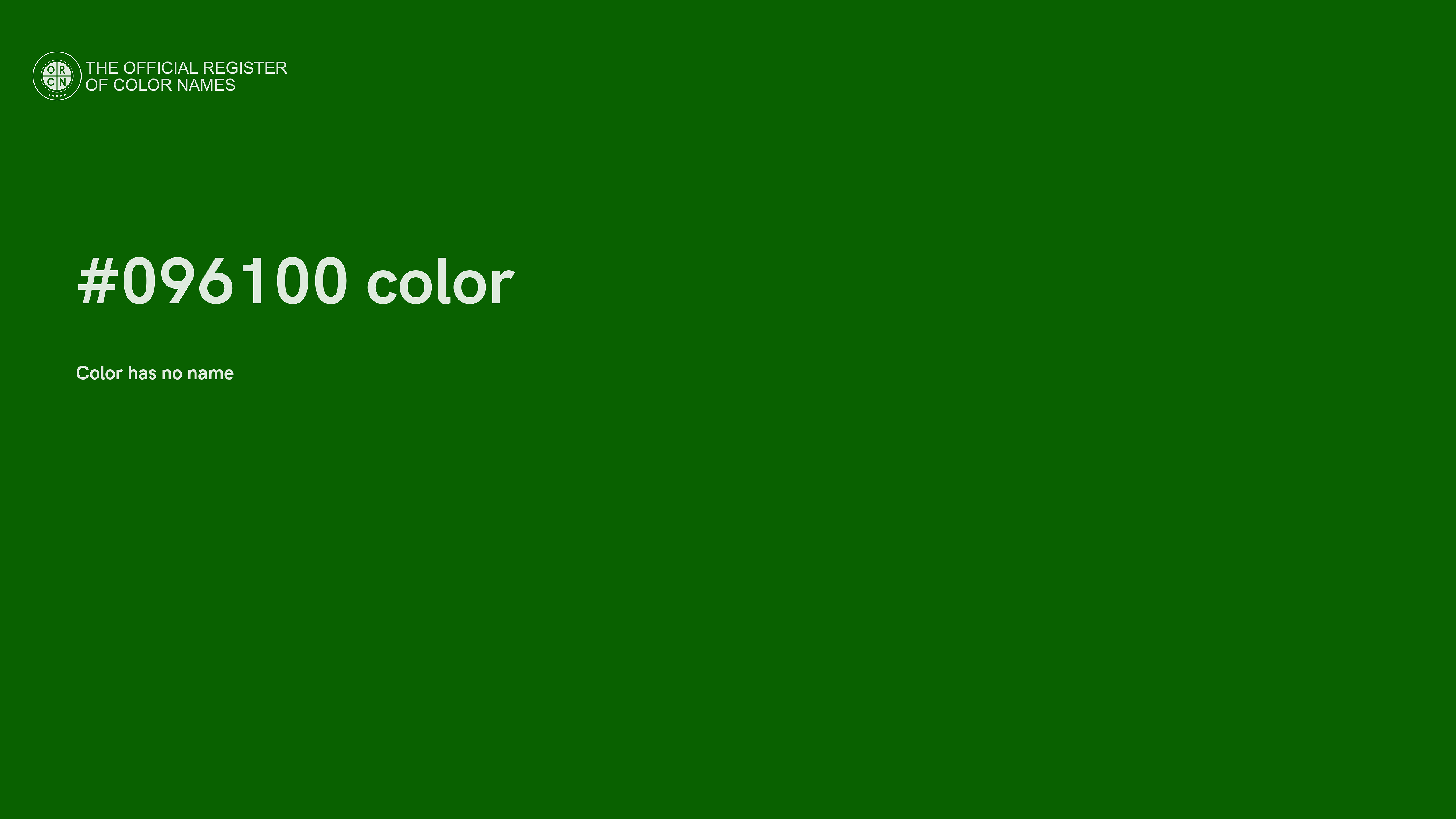 The digital color HEX #096100 belongs to the Green Color Family featuring Full Saturation (Saturation Family) and Dark (Brightness Family).