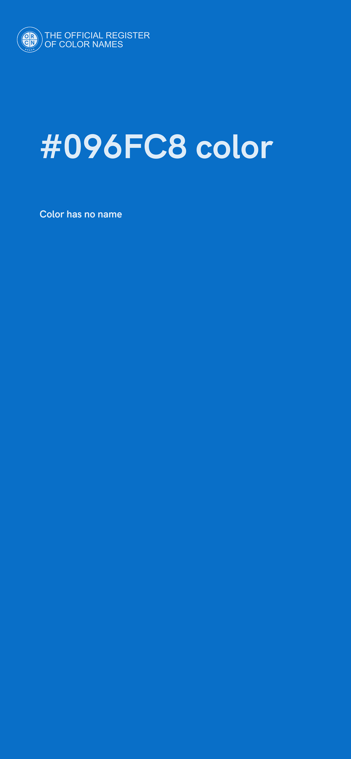 The digital color HEX #096FC8 belongs to the Azure Color Family featuring Full Saturation (Saturation Family) and Light (Brightness Family).