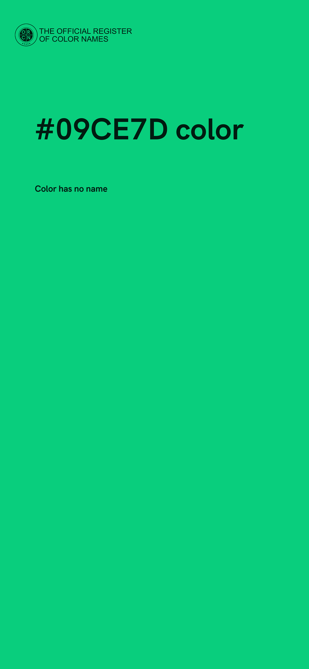 The digital color HEX #09CE7D belongs to the Spring Green Color Family featuring Full Saturation (Saturation Family) and Light (Brightness Family).