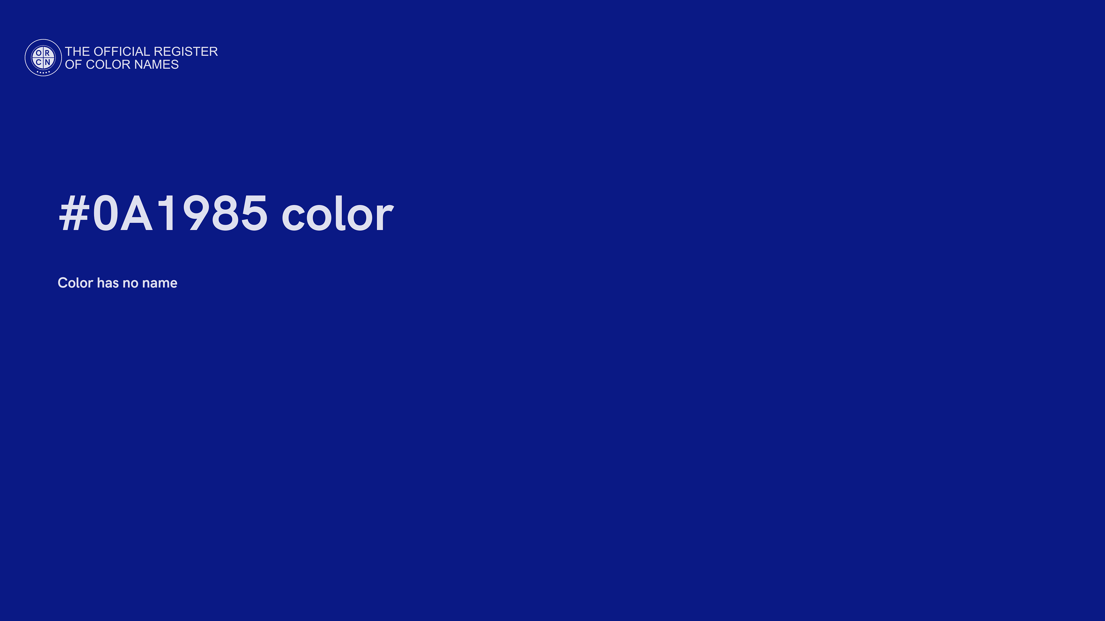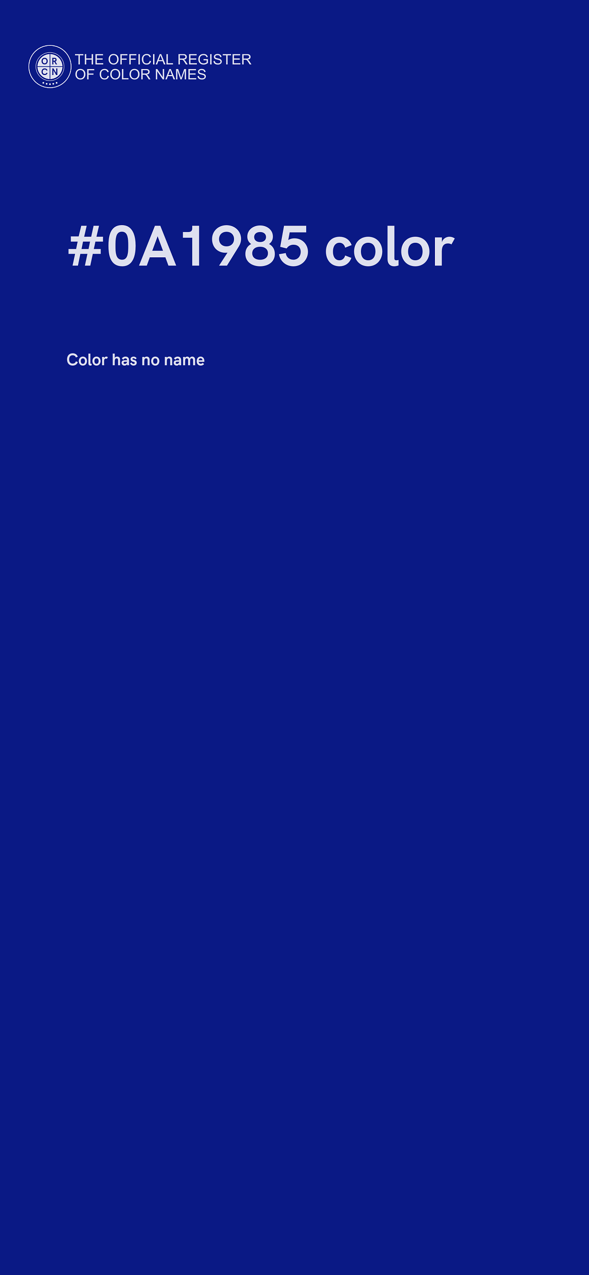 The digital color HEX #0A1985 belongs to the Blue Color Family featuring Full Saturation (Saturation Family) and Neutral (Brightness Family).