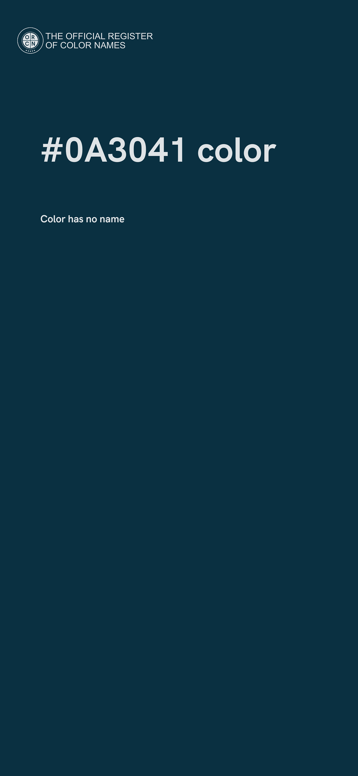 The digital color HEX #0A3041 belongs to the Azure Color Family featuring High Saturation (Saturation Family) and Dark (Brightness Family).