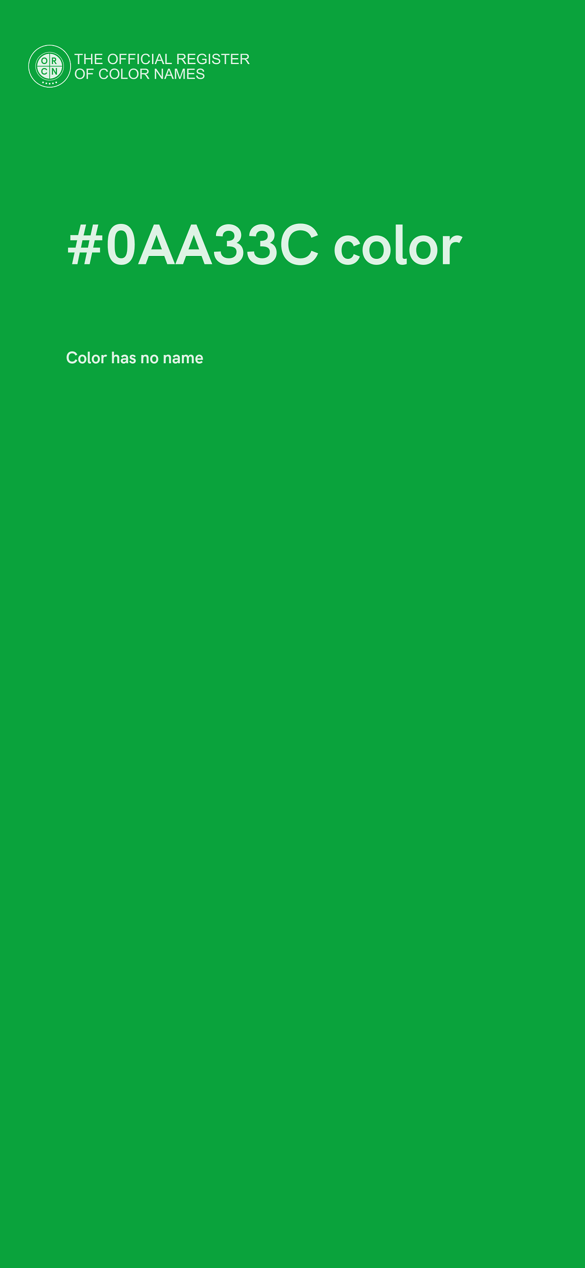The digital color HEX #0AA33C belongs to the Spring Green Color Family featuring Full Saturation (Saturation Family) and Neutral (Brightness Family).