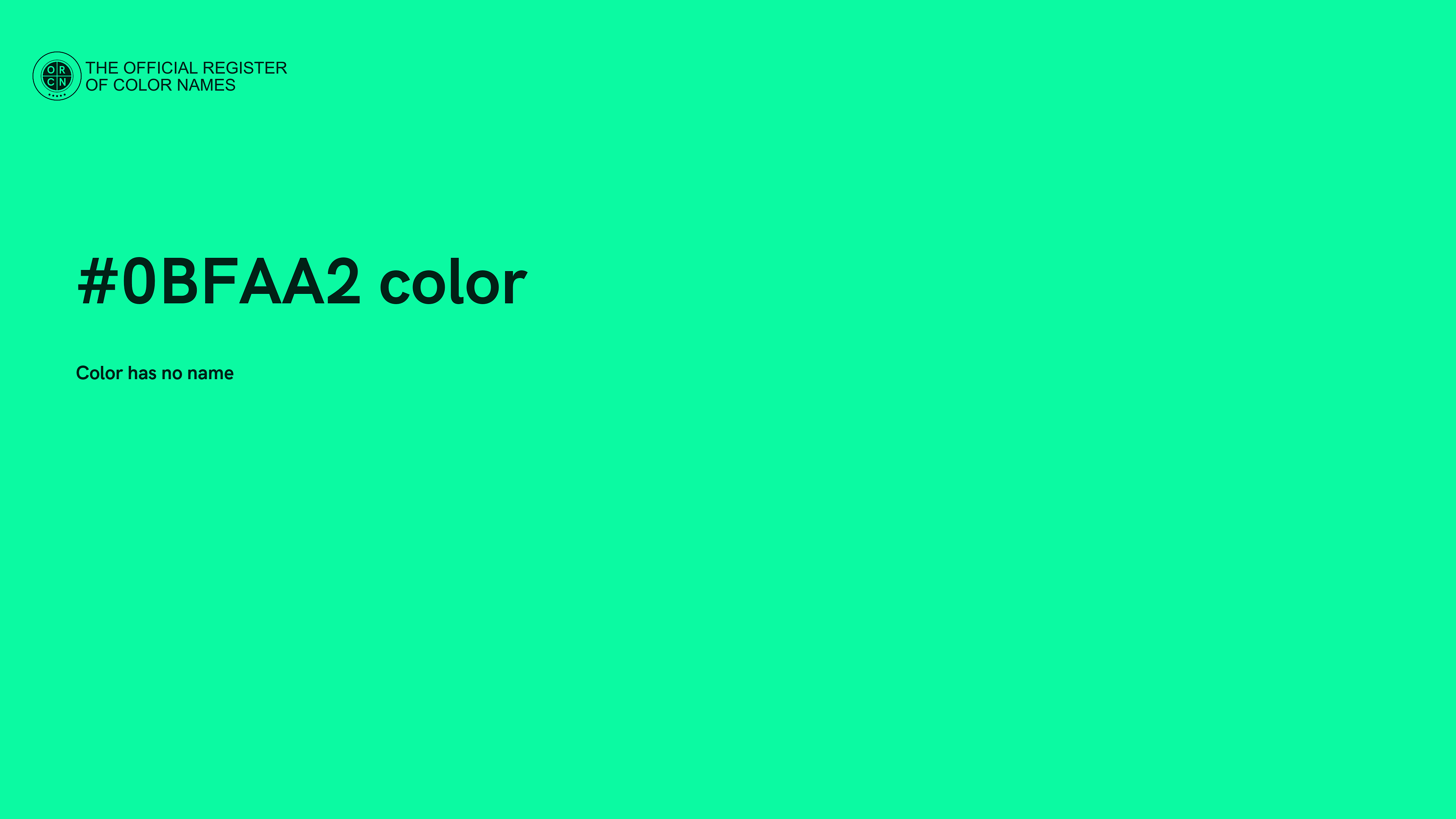 The digital color HEX #0BFAA2 belongs to the Spring Green Color Family featuring Full Saturation (Saturation Family) and Light (Brightness Family).