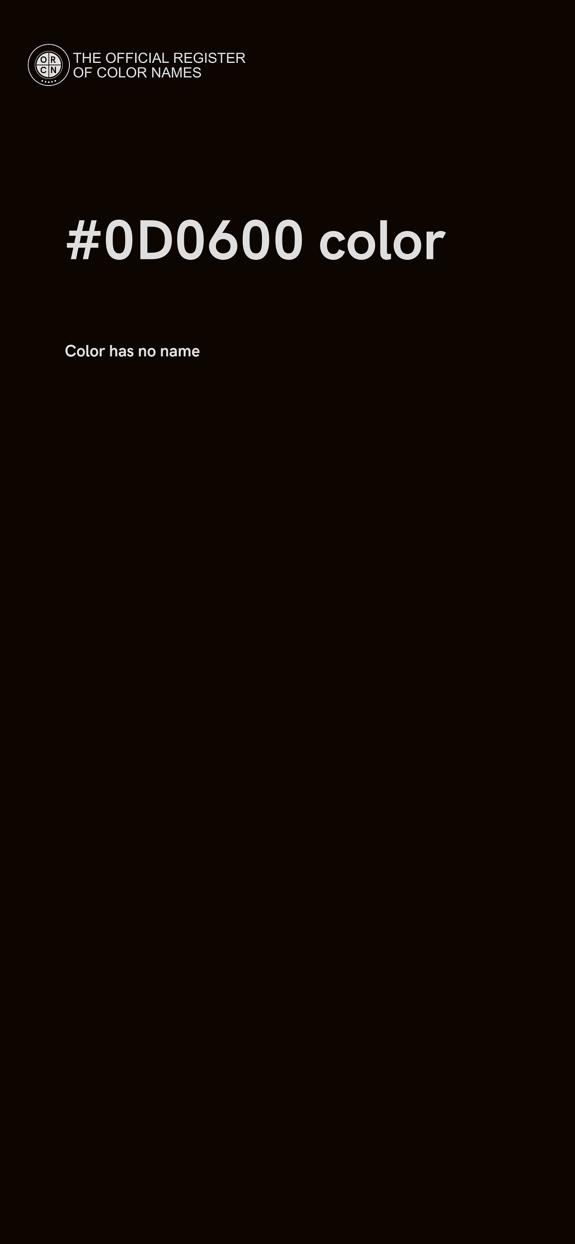 The digital color HEX #0D0600 belongs to the Orange Color Family featuring Full Saturation (Saturation Family) and Very Dark (Brightness Family).