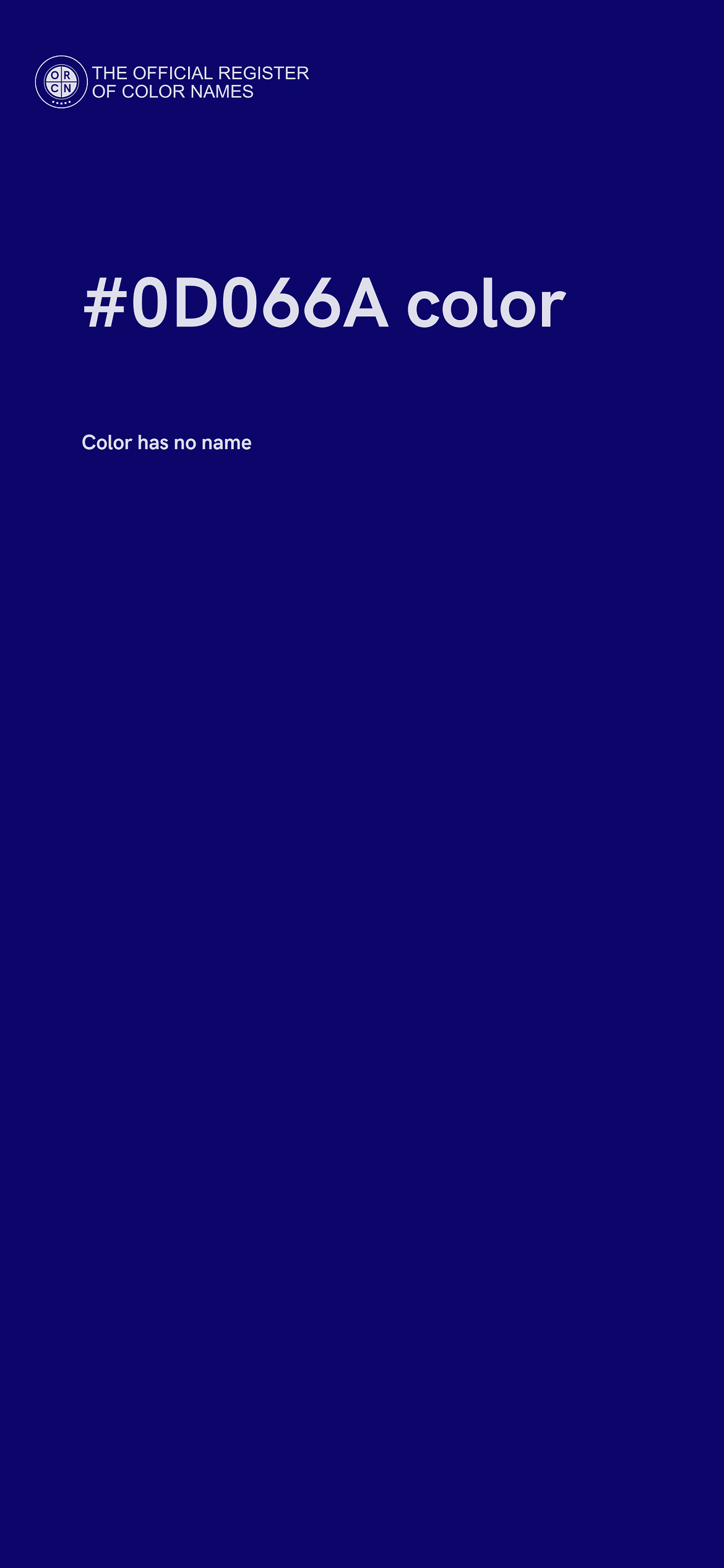 The digital color HEX #0D066A belongs to the Blue Color Family featuring Full Saturation (Saturation Family) and Dark (Brightness Family).