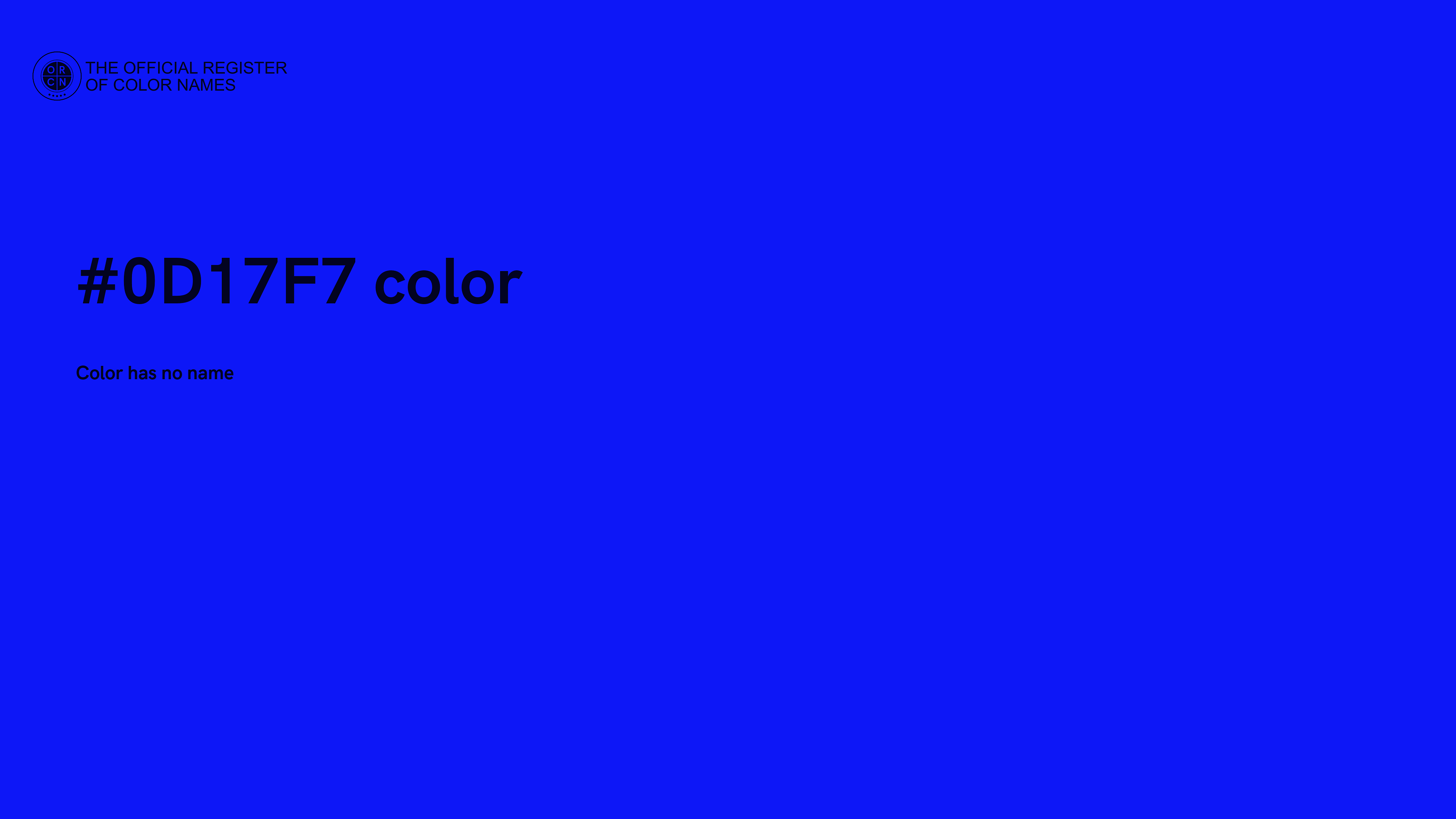 The digital color HEX #0D17F7 belongs to the Blue Color Family featuring Full Saturation (Saturation Family) and Light (Brightness Family).