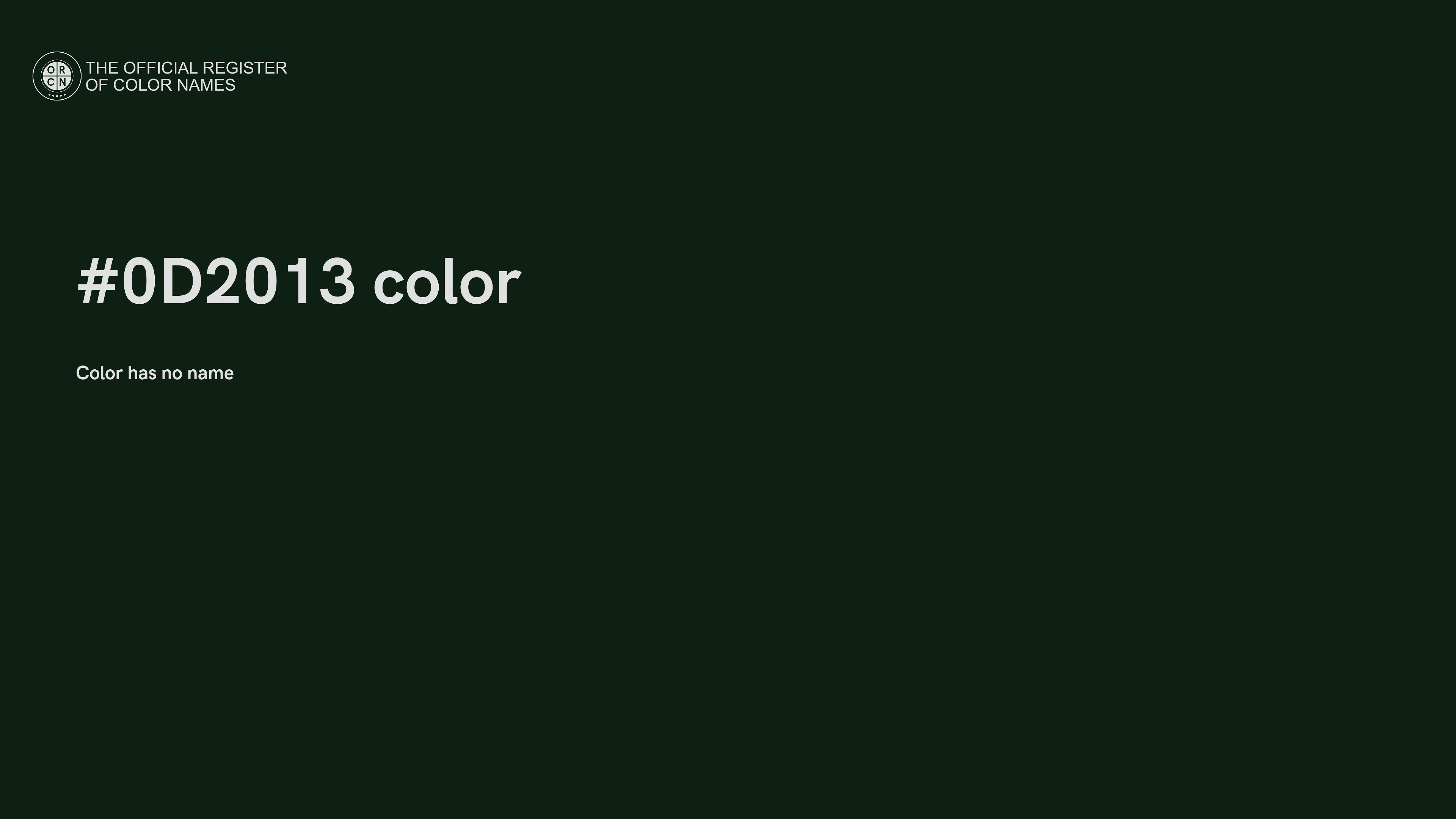 HEX code #0D2013 represent the color in hexadecimal format by combining three values – the amounts of Red, Green and Blue (RGB). Its RGB composition is 13, 32, 19 ( rgb(13, 32, 19) ), which breaks down into 5.1% of Red, 12.5% Green and 7.5% Blue.