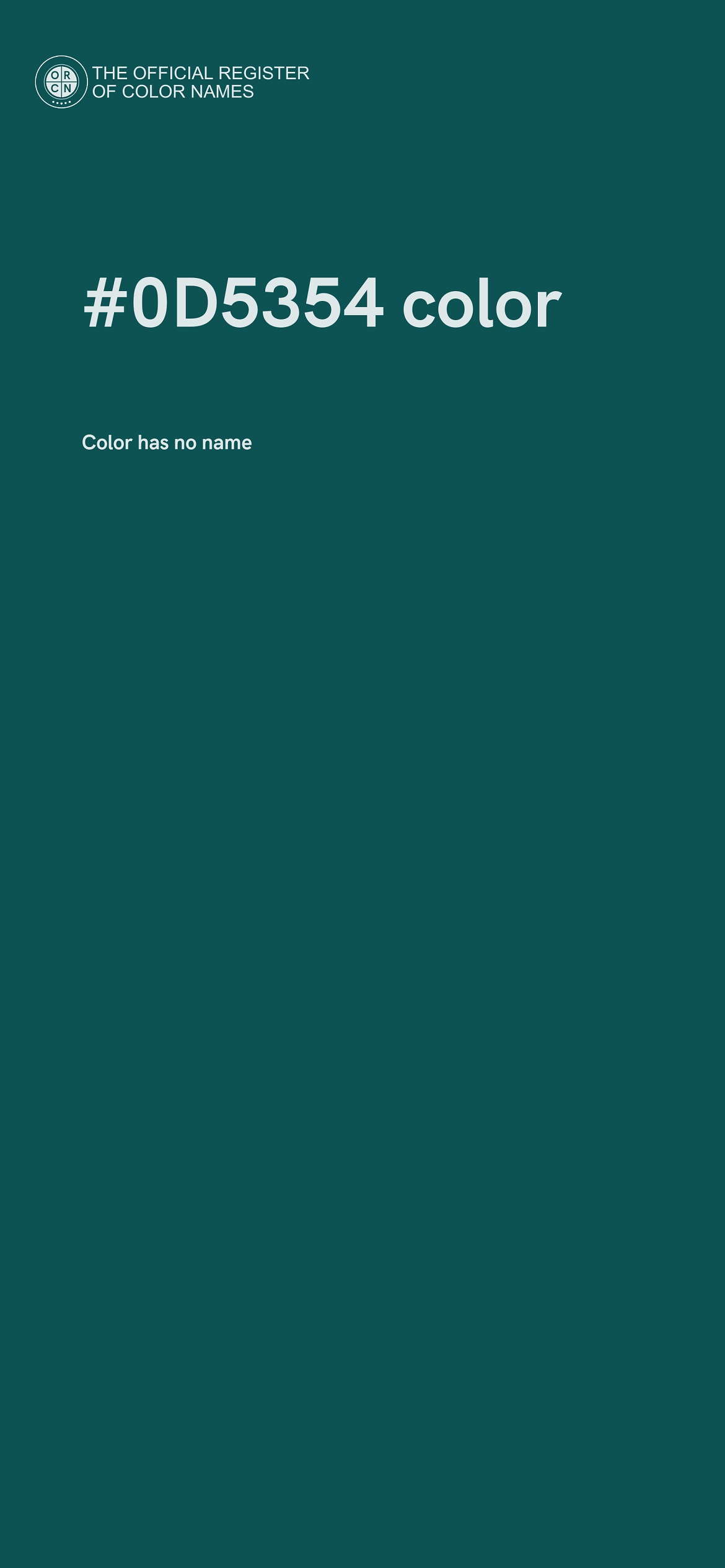The digital color HEX #0D5354 belongs to the Cyan Color Family featuring High Saturation (Saturation Family) and Dark (Brightness Family).