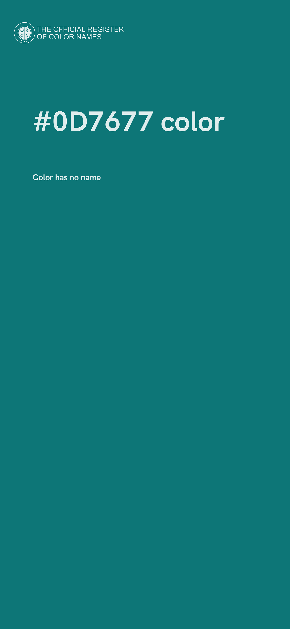The digital color HEX #0D7677 belongs to the Cyan Color Family featuring High Saturation (Saturation Family) and Neutral (Brightness Family).