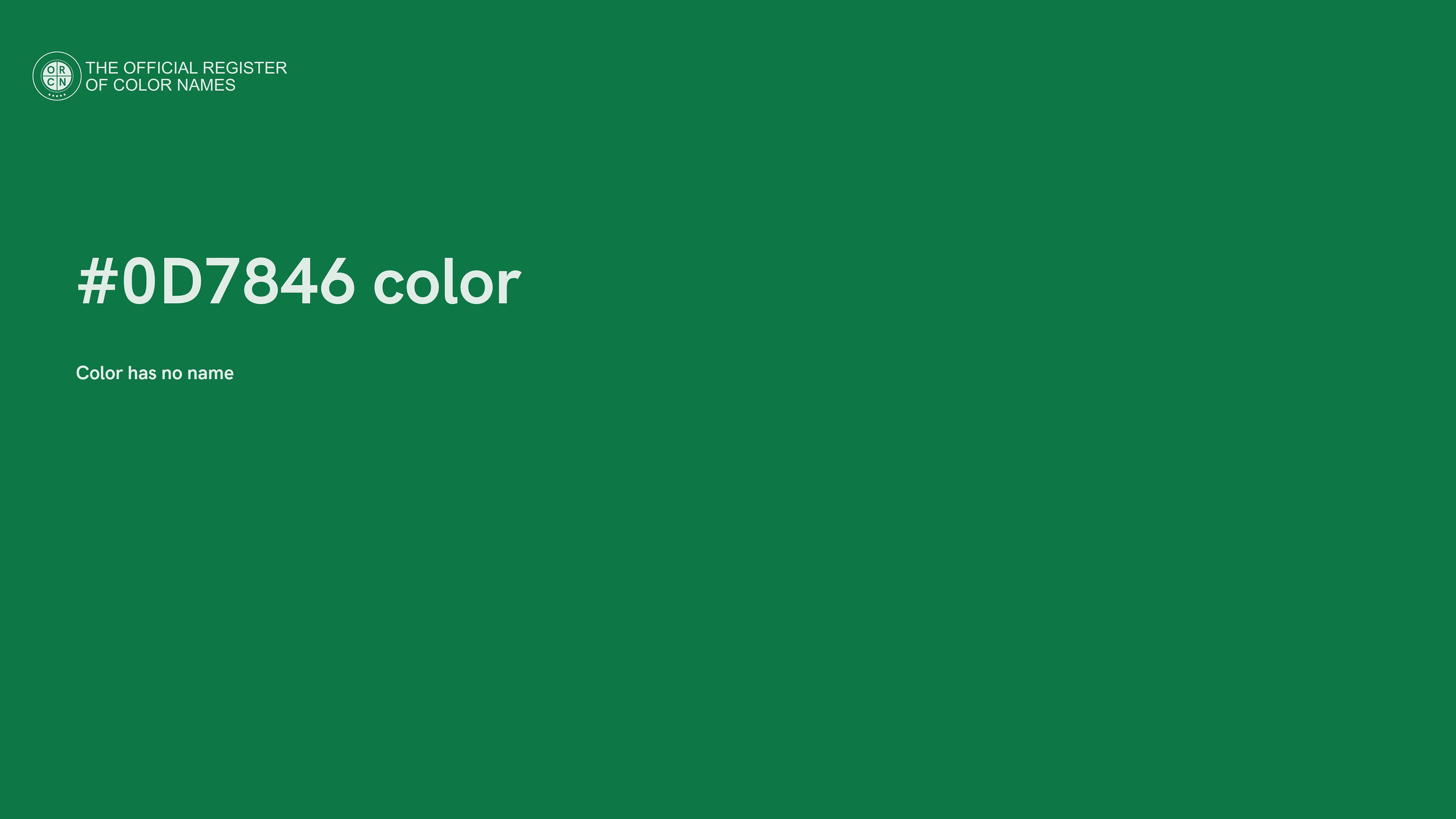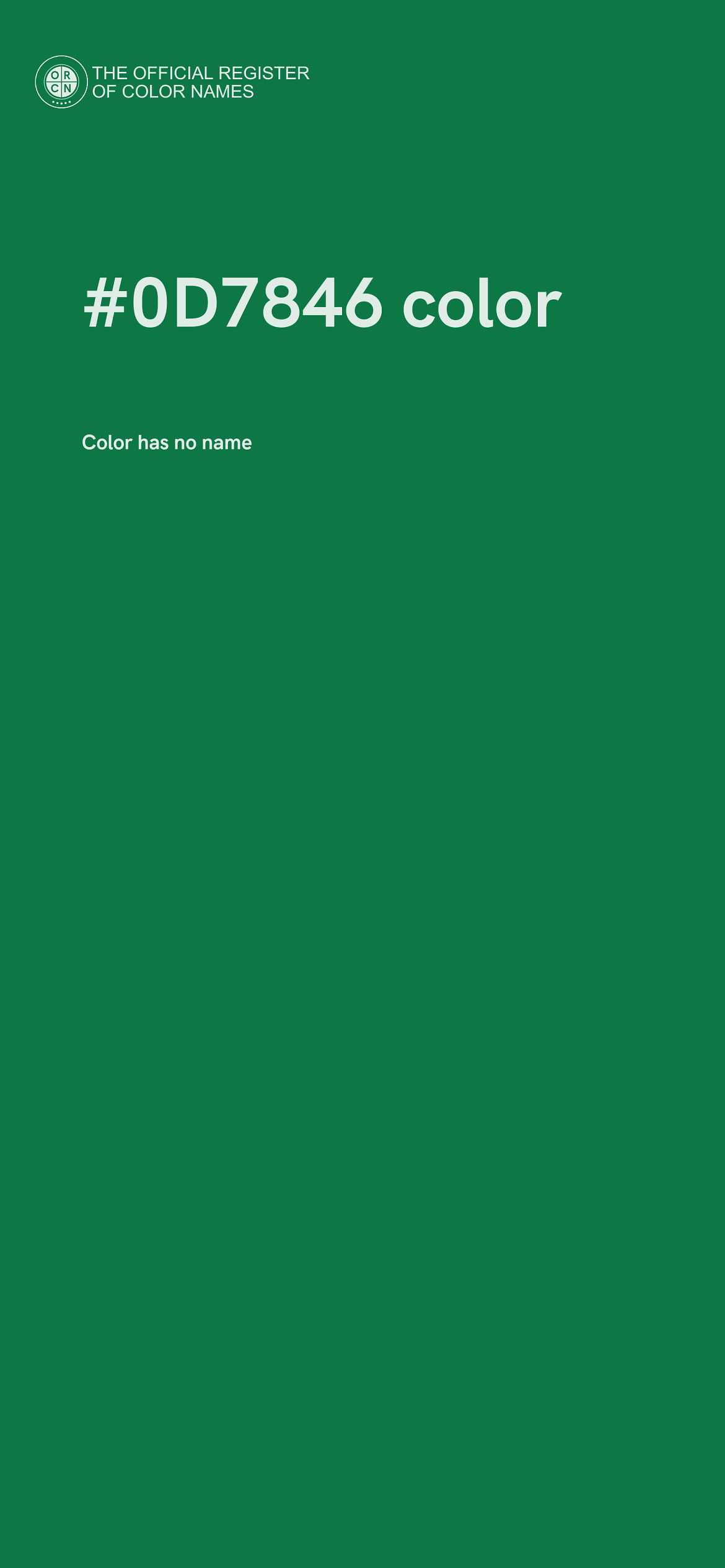 The digital color HEX #0D7846 belongs to the Spring Green Color Family featuring High Saturation (Saturation Family) and Neutral (Brightness Family).