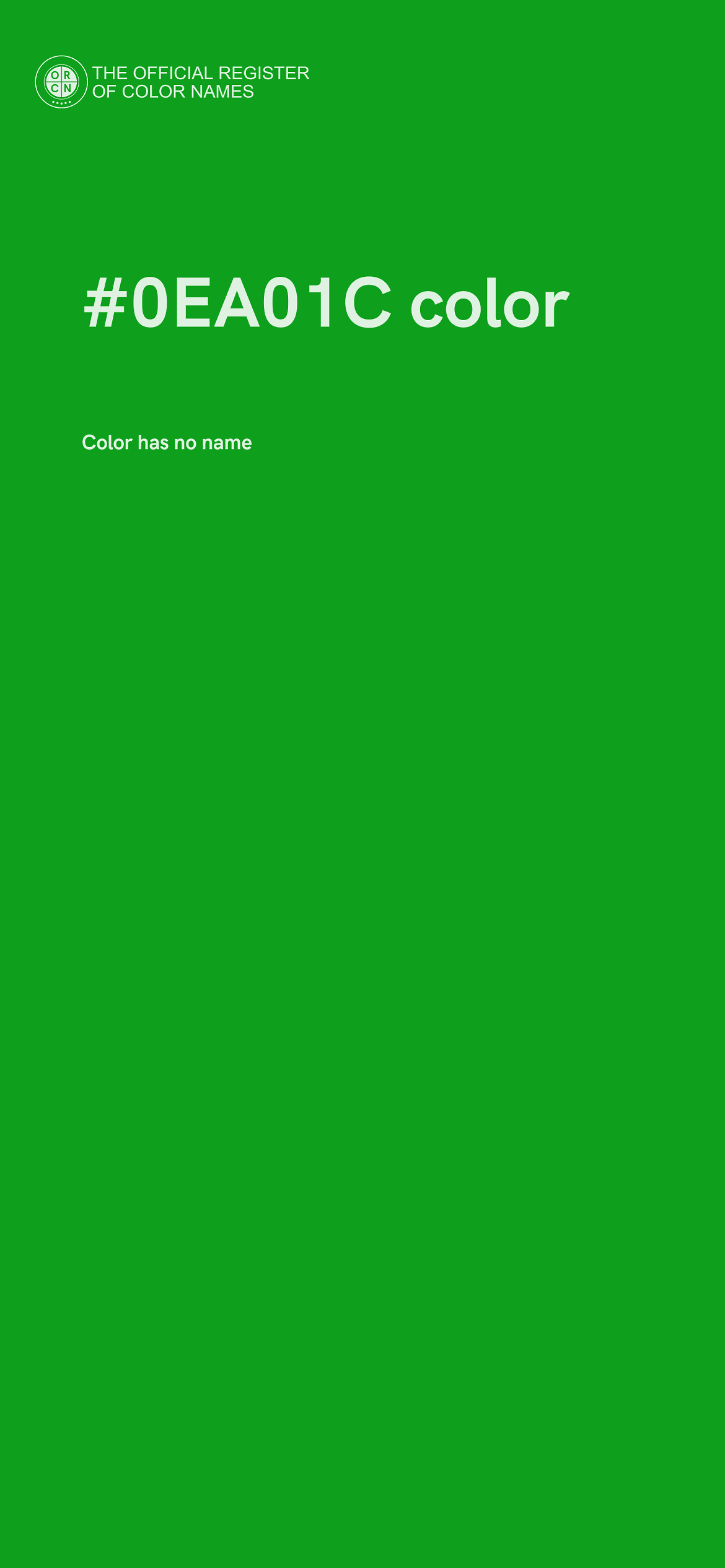 The digital color HEX #0EA01C belongs to the Green Color Family featuring High Saturation (Saturation Family) and Neutral (Brightness Family).