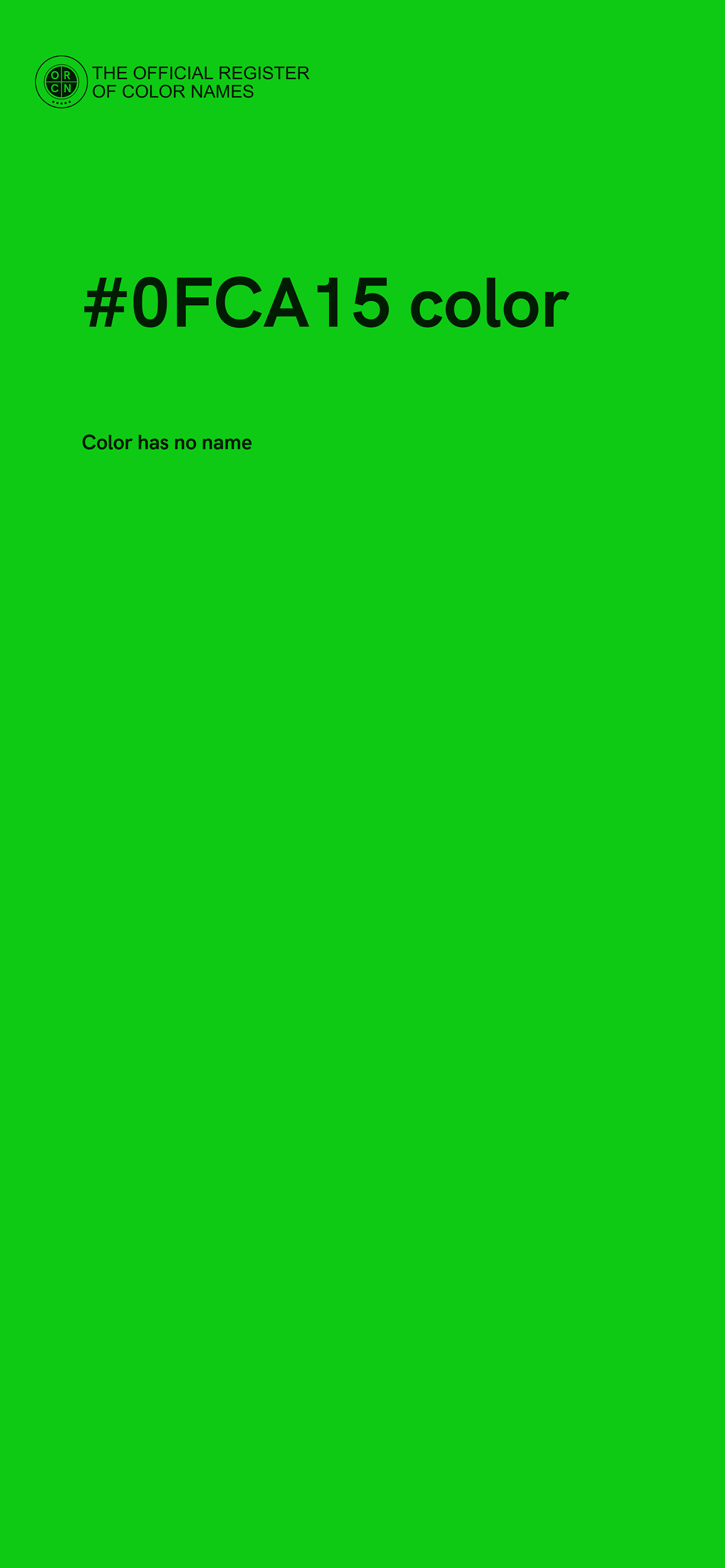 The digital color HEX #0FCA15 belongs to the Green Color Family featuring Full Saturation (Saturation Family) and Light (Brightness Family).
