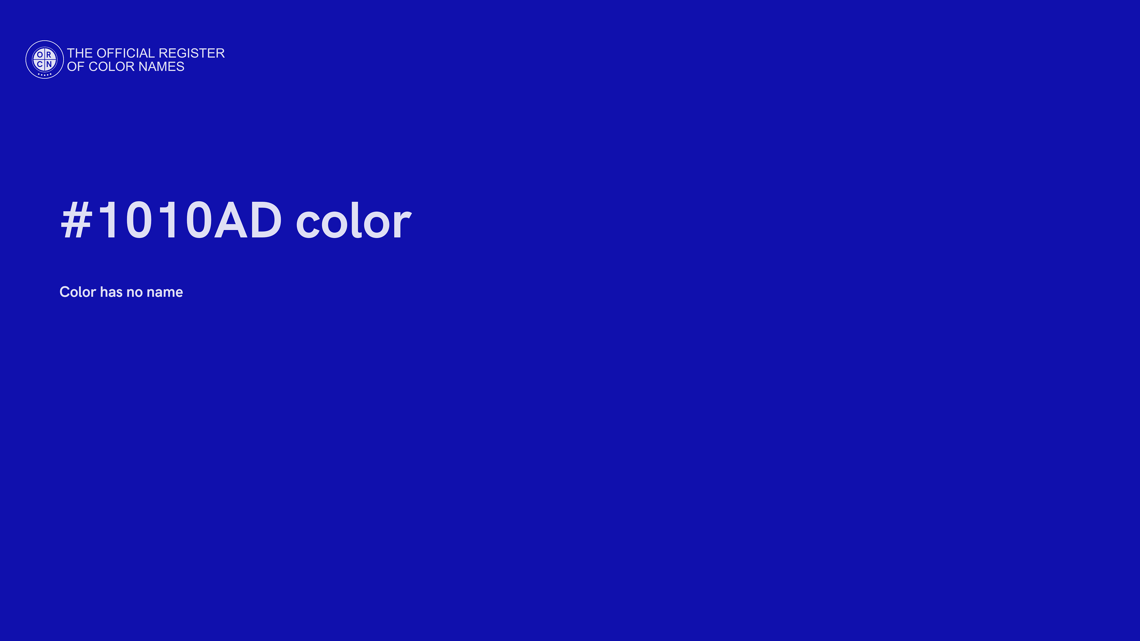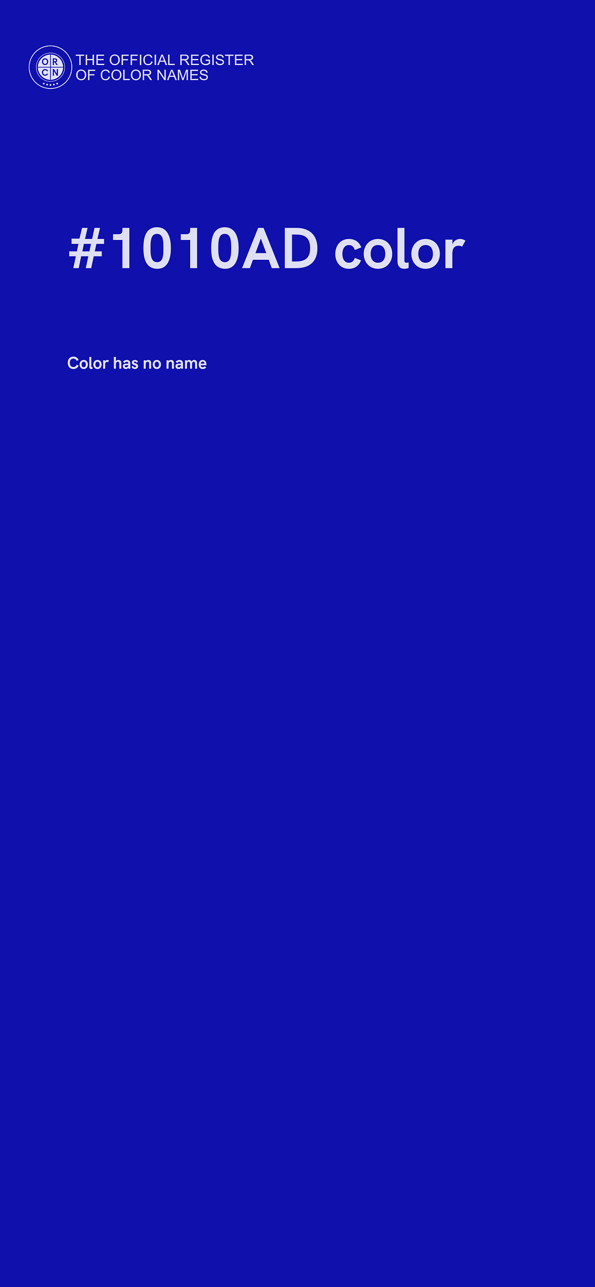 The digital color HEX #1010AD belongs to the Blue Color Family featuring High Saturation (Saturation Family) and Neutral (Brightness Family).
