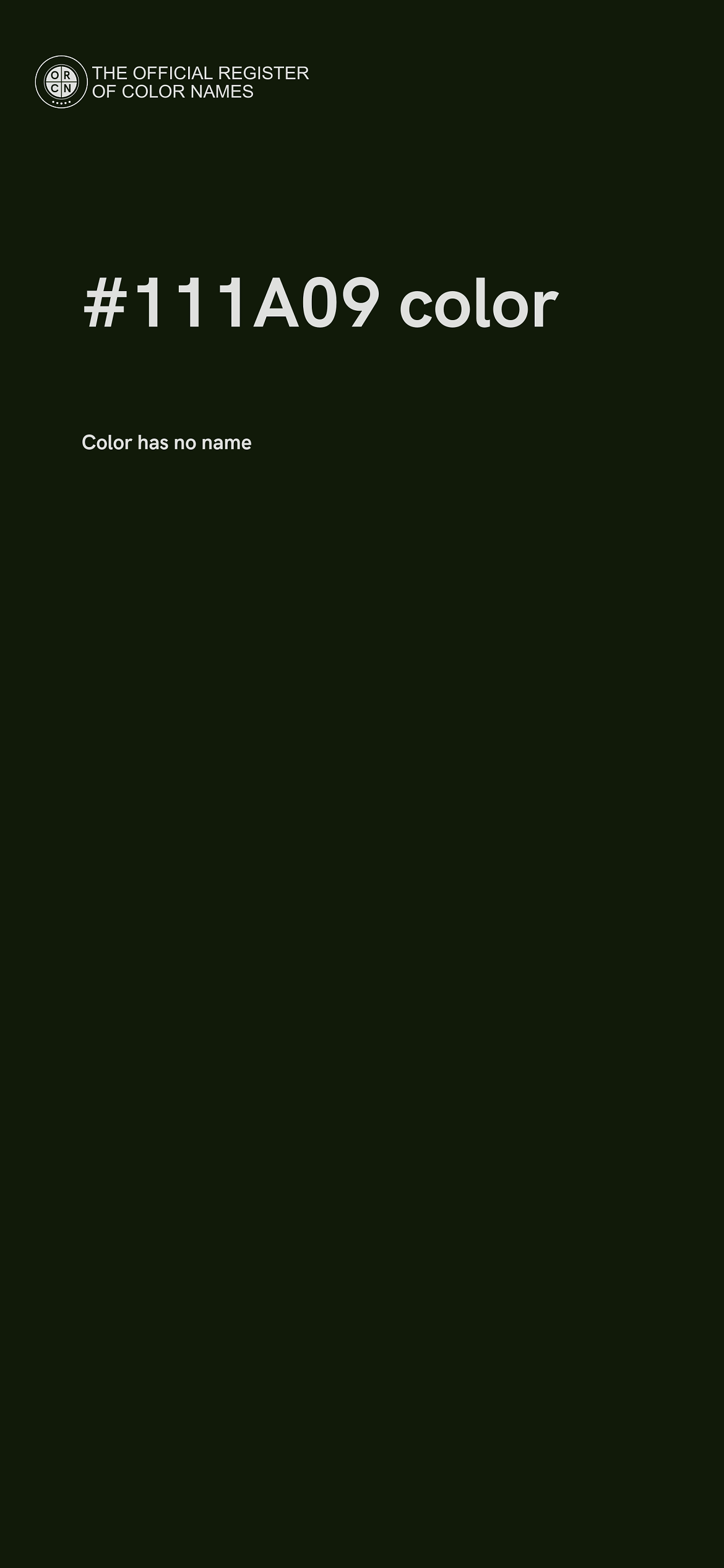 The digital color HEX #111A09 belongs to the Chartreuse Color Family featuring Moderate Saturation (Saturation Family) and Very Dark (Brightness Family).