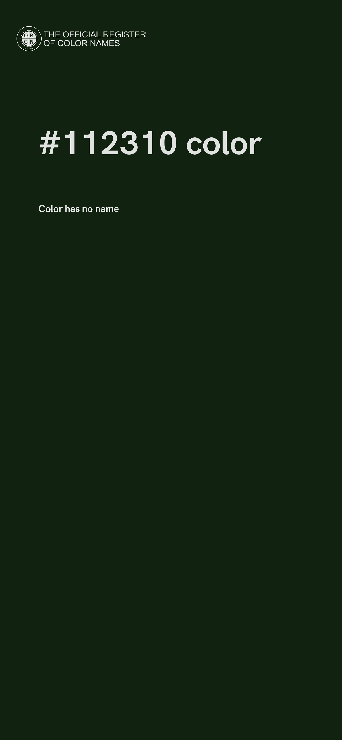 The digital color HEX #112310 belongs to the Green Color Family featuring Mild Saturation (Saturation Family) and Dark (Brightness Family).