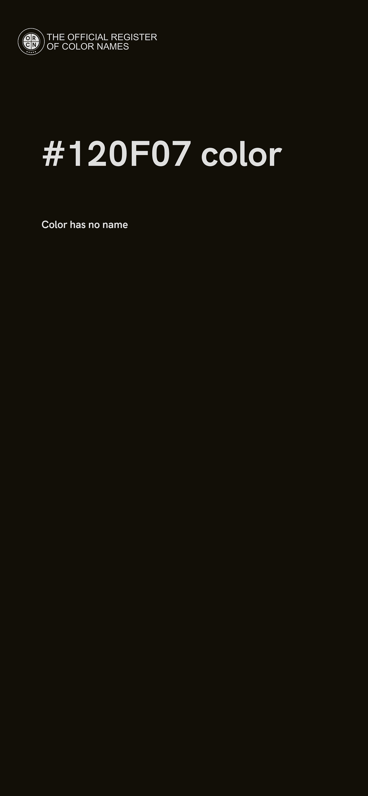 The digital color HEX #120F07 belongs to the Orange Color Family featuring Moderate Saturation (Saturation Family) and Very Dark (Brightness Family).