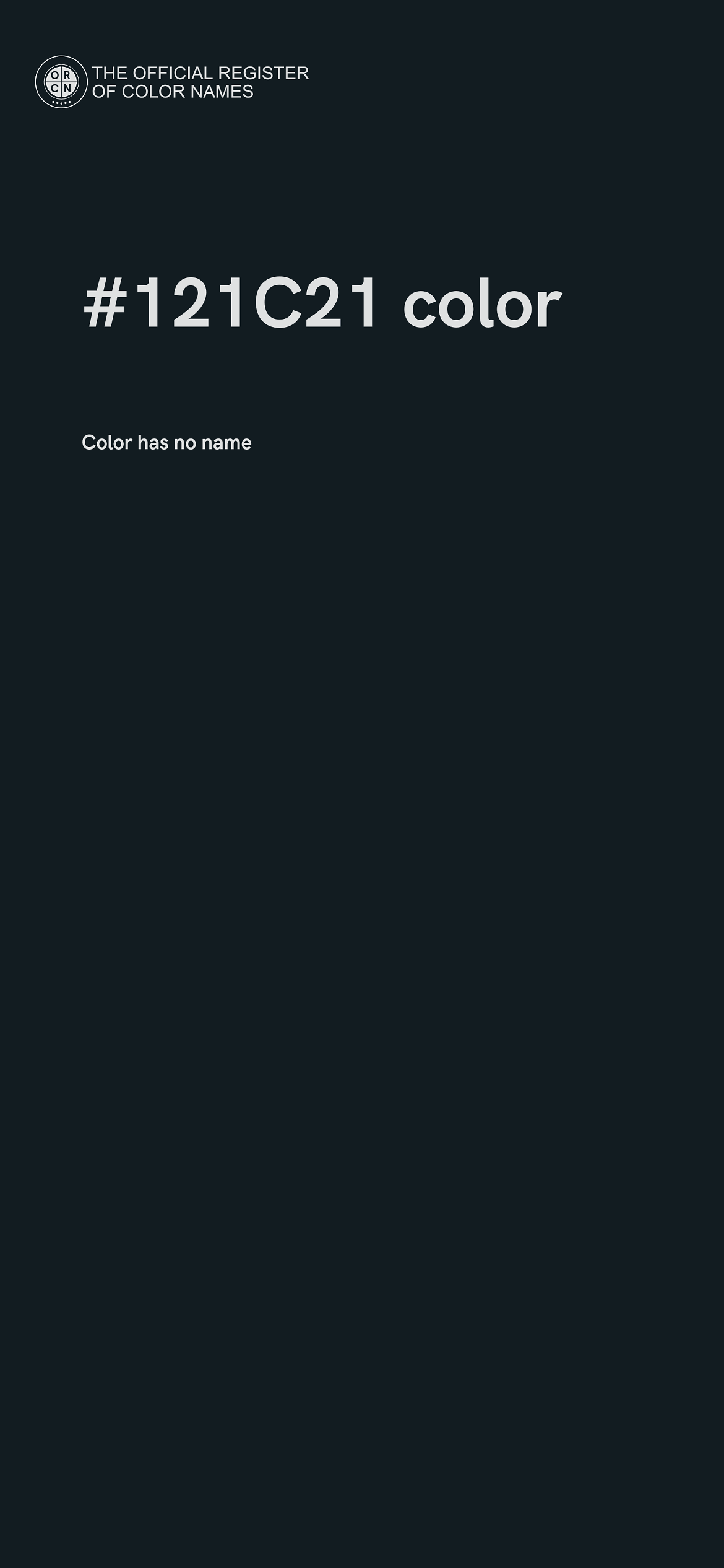 The digital color HEX #121C21 belongs to the Azure Color Family featuring Mild Saturation (Saturation Family) and Dark (Brightness Family).