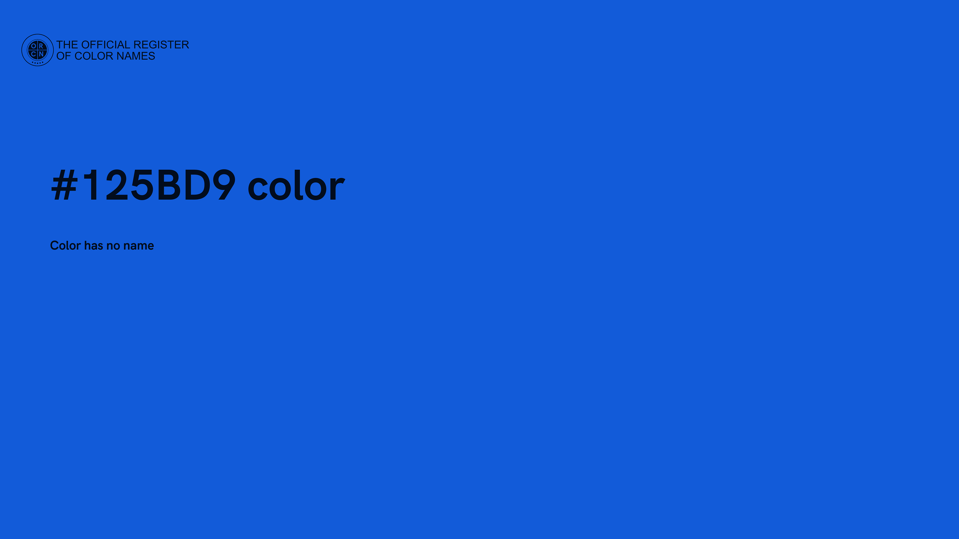 HEX code #125BD9 represent the color in hexadecimal format by combining three values – the amounts of Red, Green and Blue (RGB). Its RGB composition is 18, 91, 217 ( rgb(18, 91, 217) ), which breaks down into 7.1% of Red, 35.7% Green and 85.1% Blue.