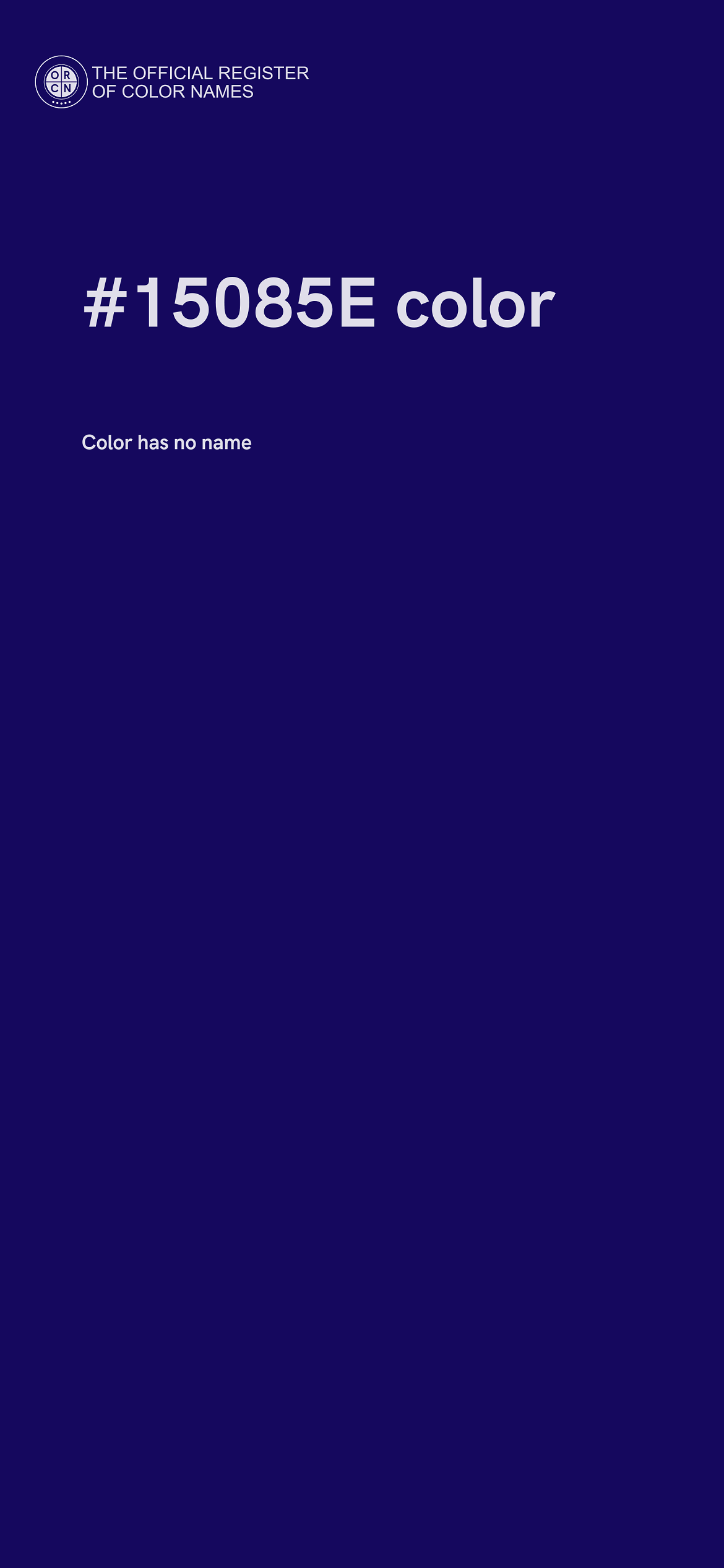 The digital color HEX #15085E belongs to the Blue Color Family featuring High Saturation (Saturation Family) and Dark (Brightness Family).