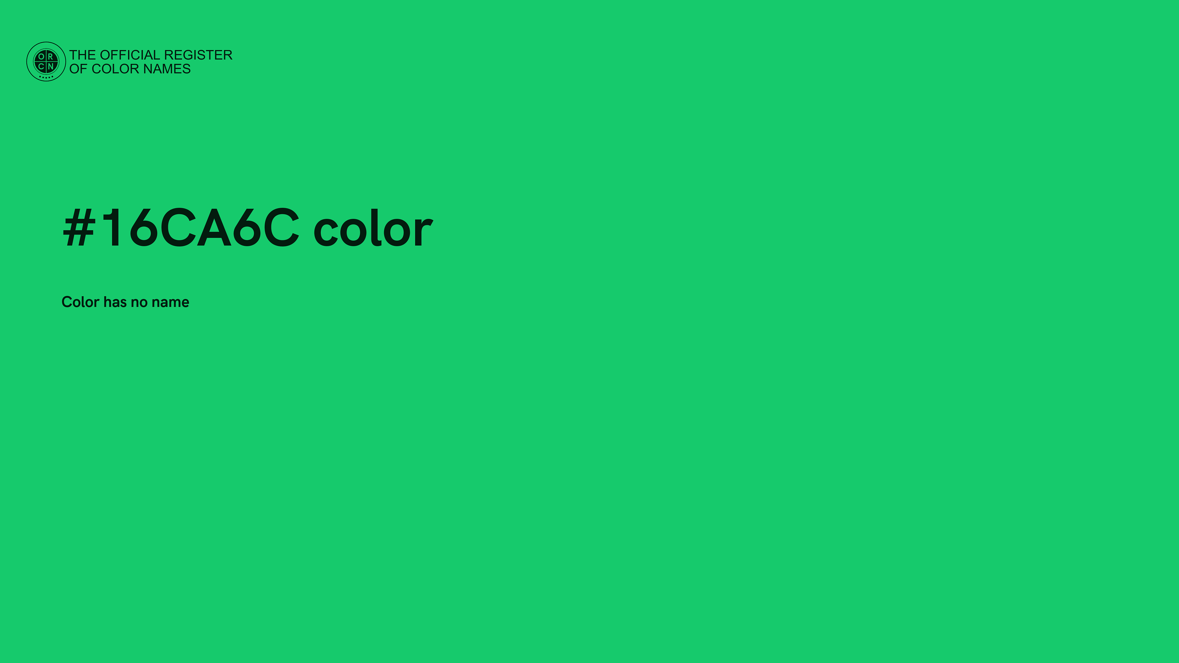 The digital color HEX #16CA6C belongs to the Spring Green Color Family featuring High Saturation (Saturation Family) and Light (Brightness Family).