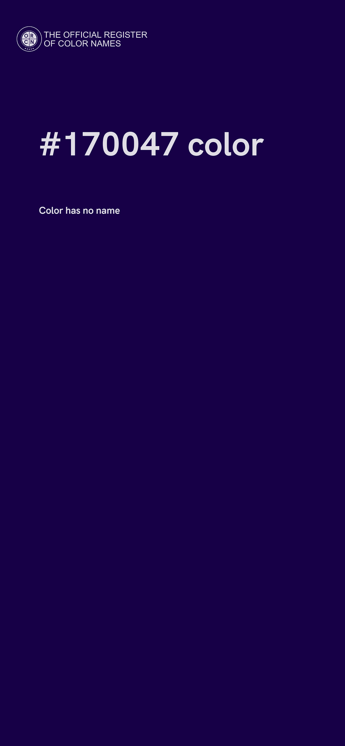 The digital color HEX #170047 belongs to the Violet Color Family featuring Full Saturation (Saturation Family) and Dark (Brightness Family).
