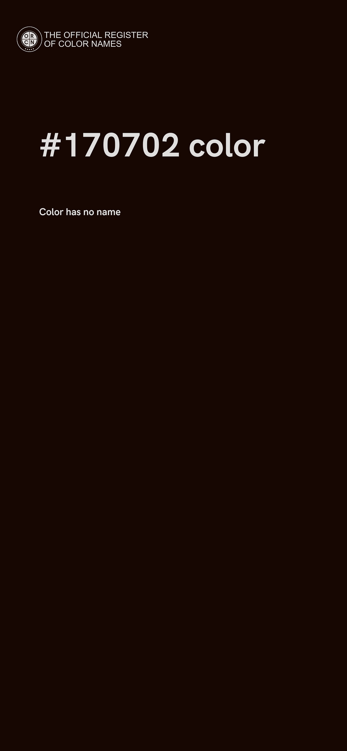 The digital color HEX #170702 belongs to the Red Color Family featuring High Saturation (Saturation Family) and Very Dark (Brightness Family).