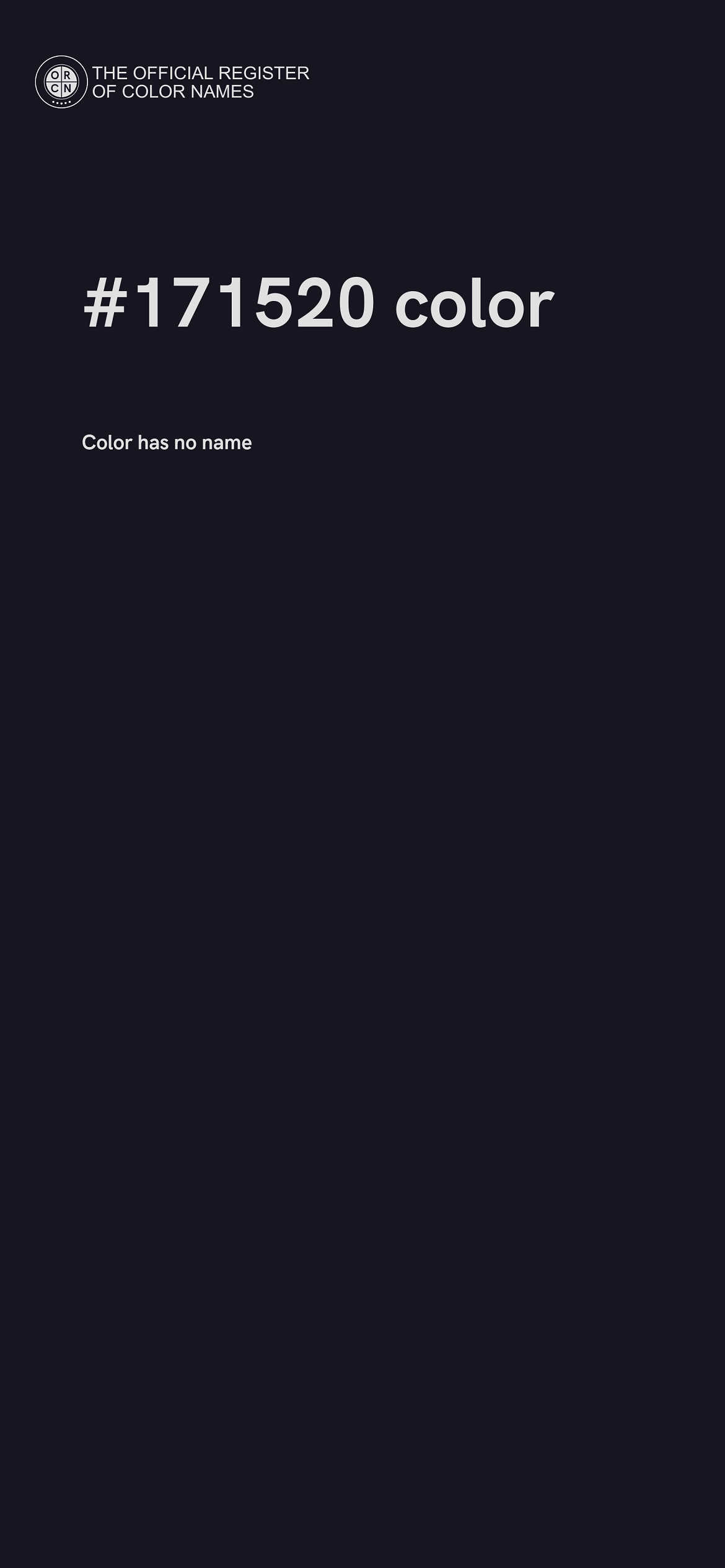 The digital color HEX #171520 belongs to the Blue Color Family featuring Low Saturation (Saturation Family) and Dark (Brightness Family).